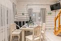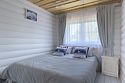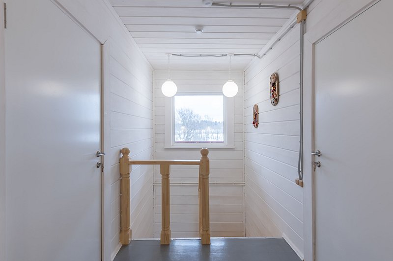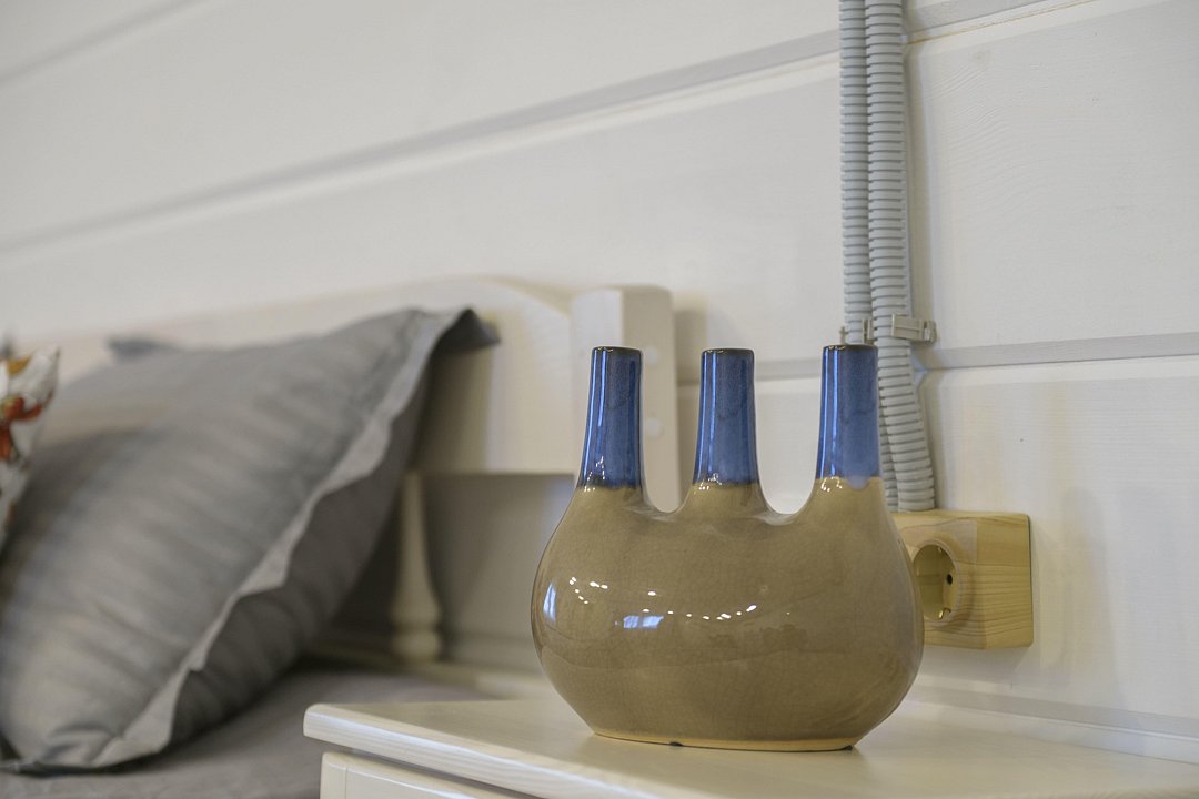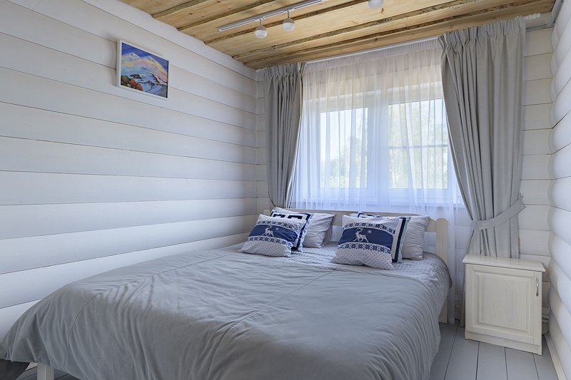 Дом предназначен для десяти гостей (включая детей старше трех лет). В доме на втором этаже три изолированных спальни с кроватями 180х200. На первом этаже теплый пол, гостиная-столовая с голландской печью и двуспальным диваном, туалетная комната с душевой кабиной, финская сауна с электропечью.