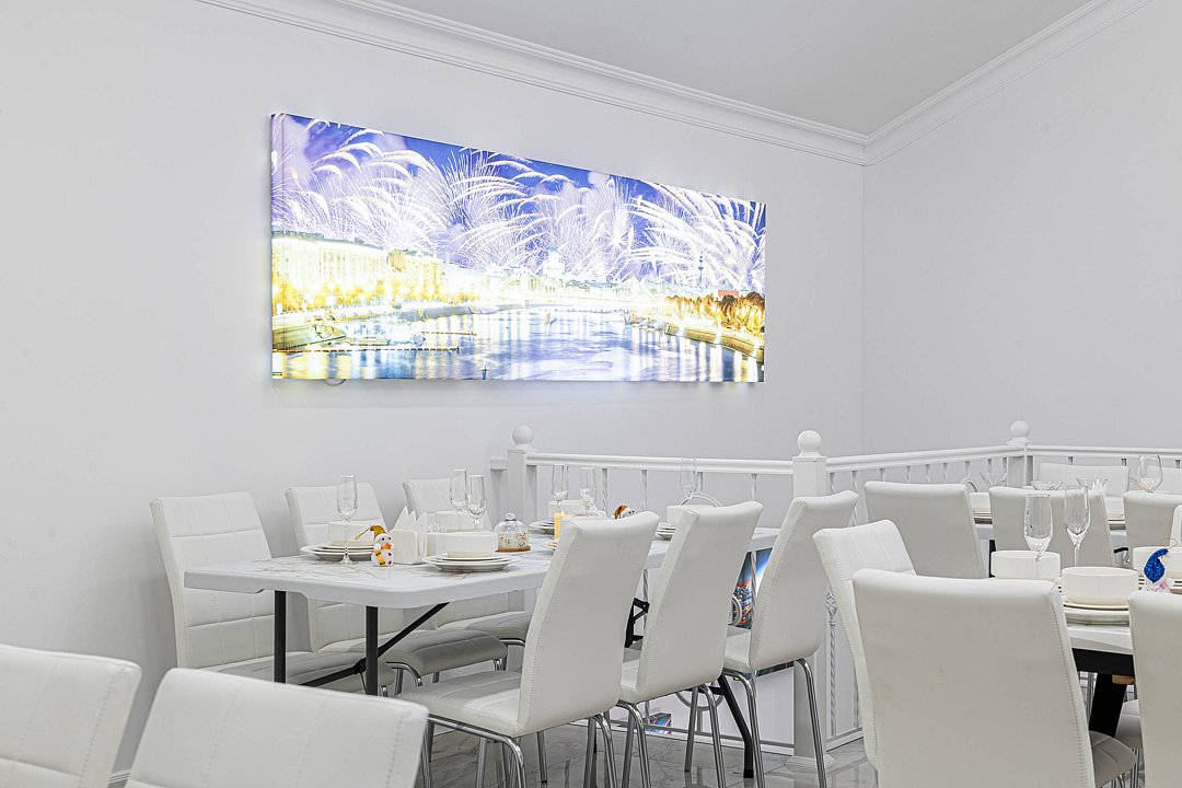 Подходит для банкетов и проведения мини-свадеб. Комфортное размещение шестнадцати человек. Банкет – до двадцати двух человек.