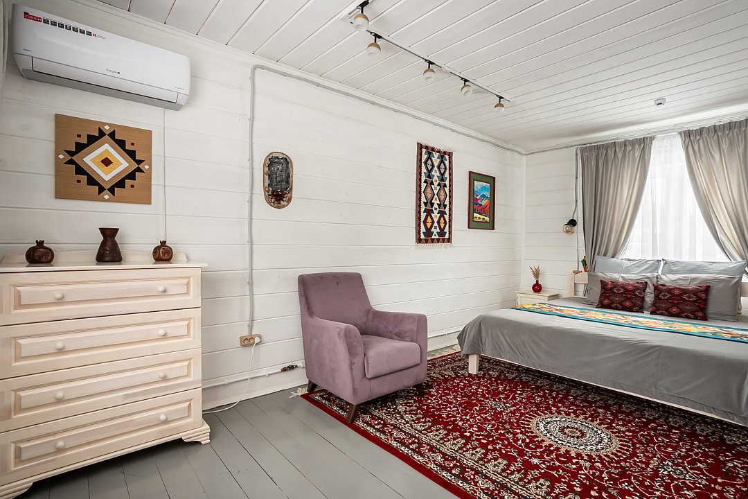 Дом из кедрового сруба, рассчитан на пять человек, с настоящей русской баней на дровах. В доме две спальни на втором этаже с кроватями 180х200, в одной комнате двухспальный диван. На первом этаже: гостиная, столовая, туалетная комната, душевая кабина. Есть кондиционер. Русская парная рассчитана на четыре-пять человек.