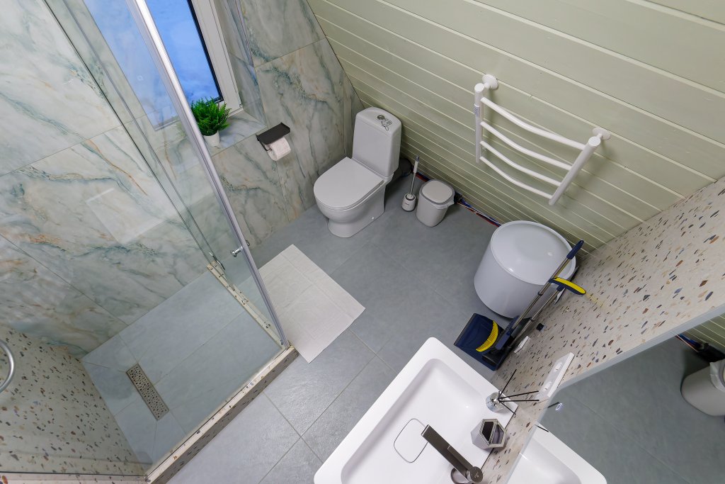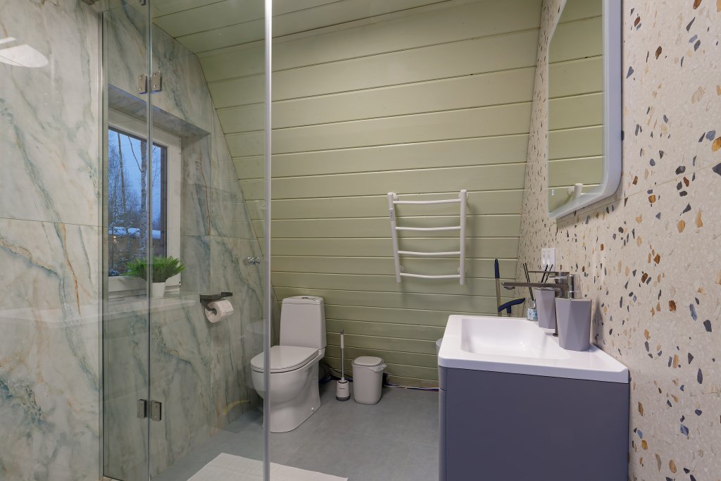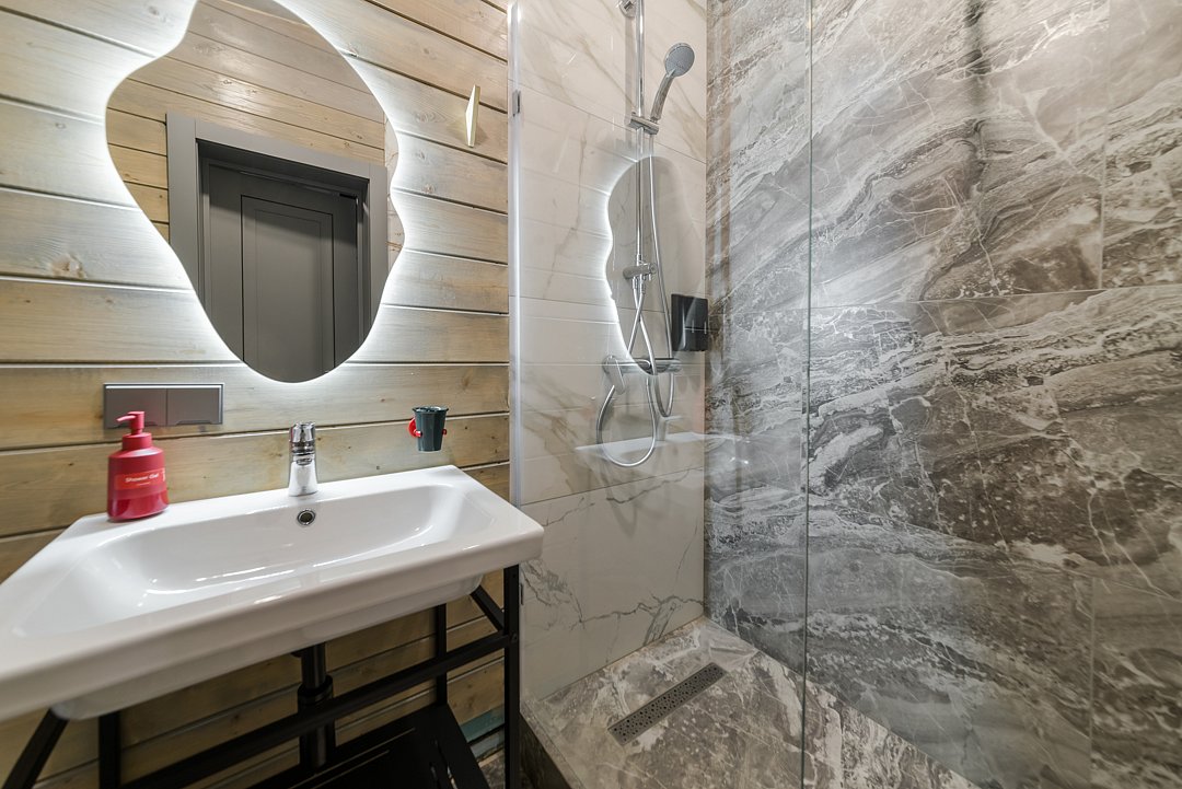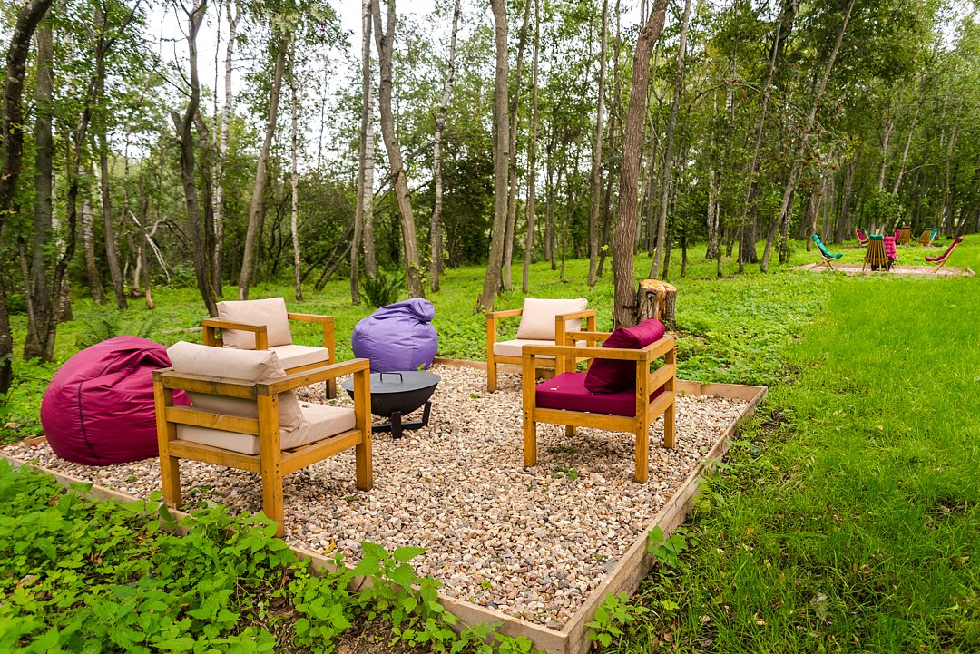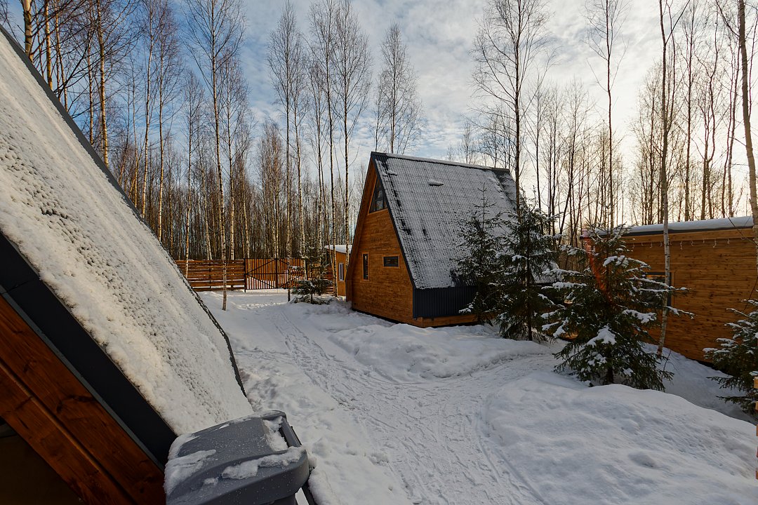 Инфраструктура: зона отдыха, шапочки, обливное ведро, душУ домика А-фрейм есть еще баня.
