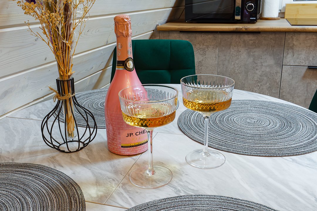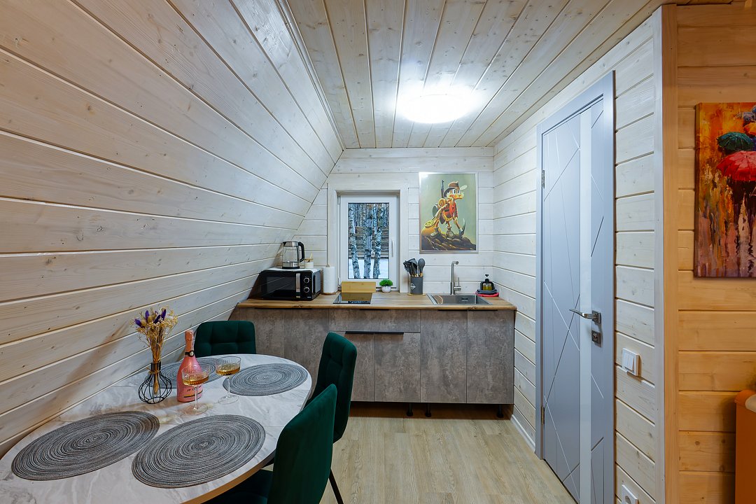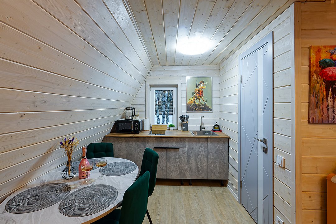 В каждом домике с комфортом разместятся до 4 человек: двое на уютной спальне наверху и двое на раскладном диване в просторной кухне-гостиной. Вас ждет полностью оборудованная кухня, собственная терраса для вечерних посиделок и мангальная зона для ароматного барбекю. А для полного релакса — банный чан и баня (оплачиваются отдельно). Погрузитесь в атмосферу спокойствия и насладитесь природой!