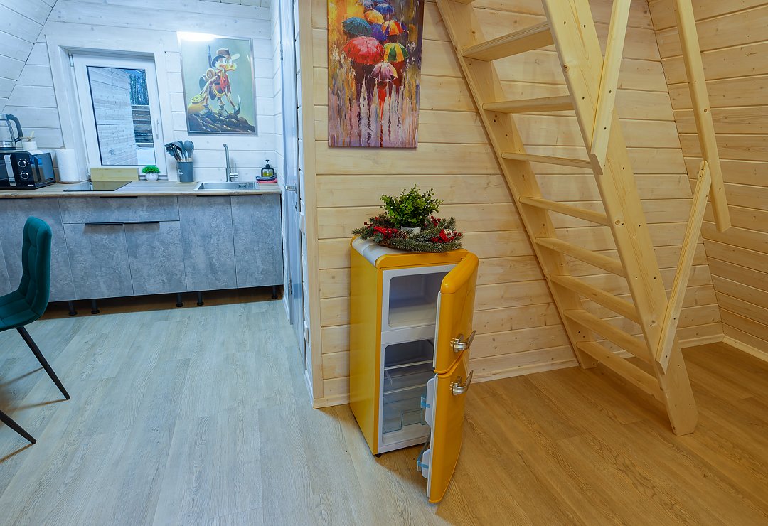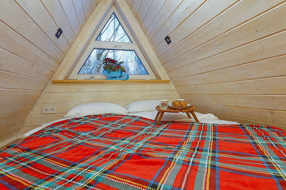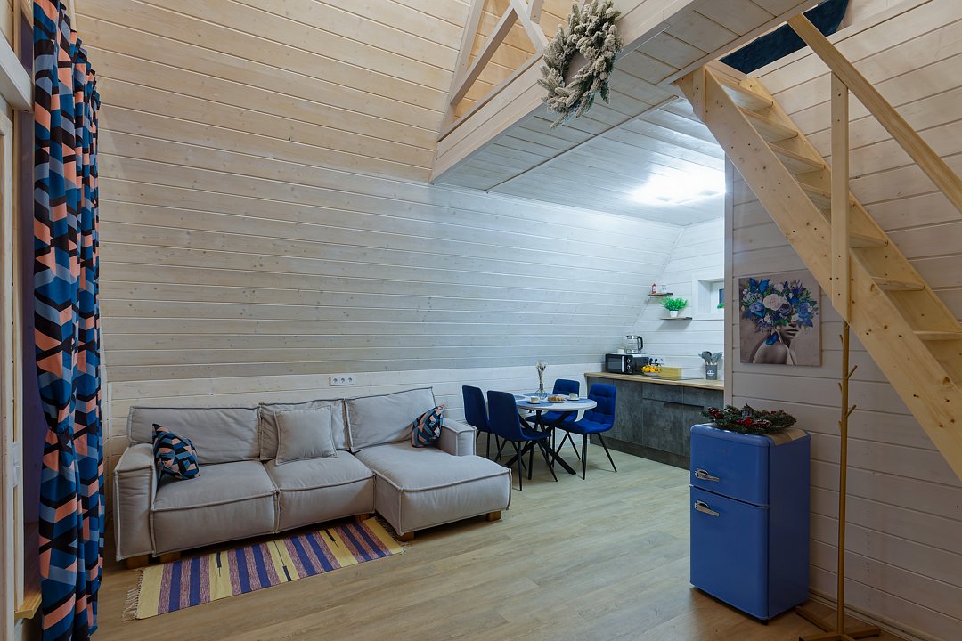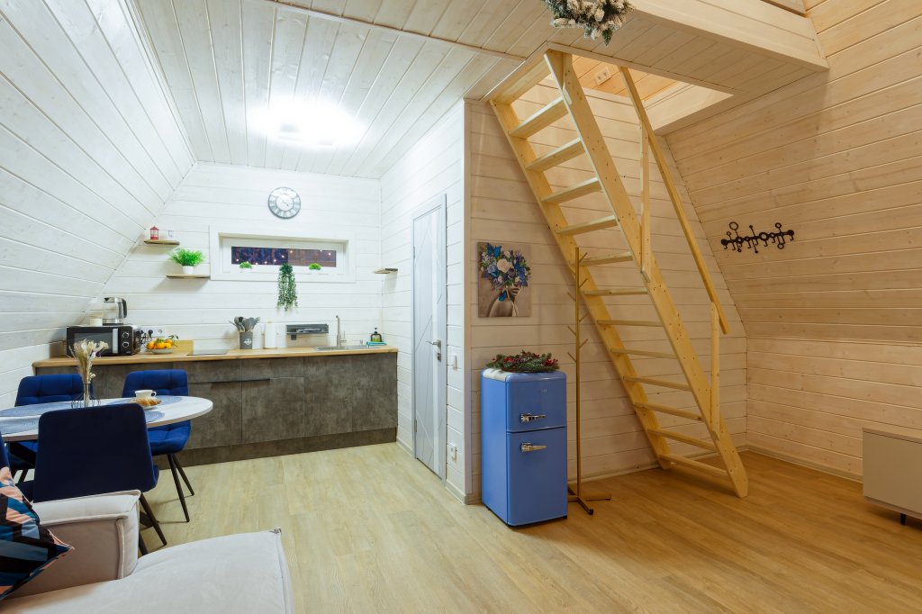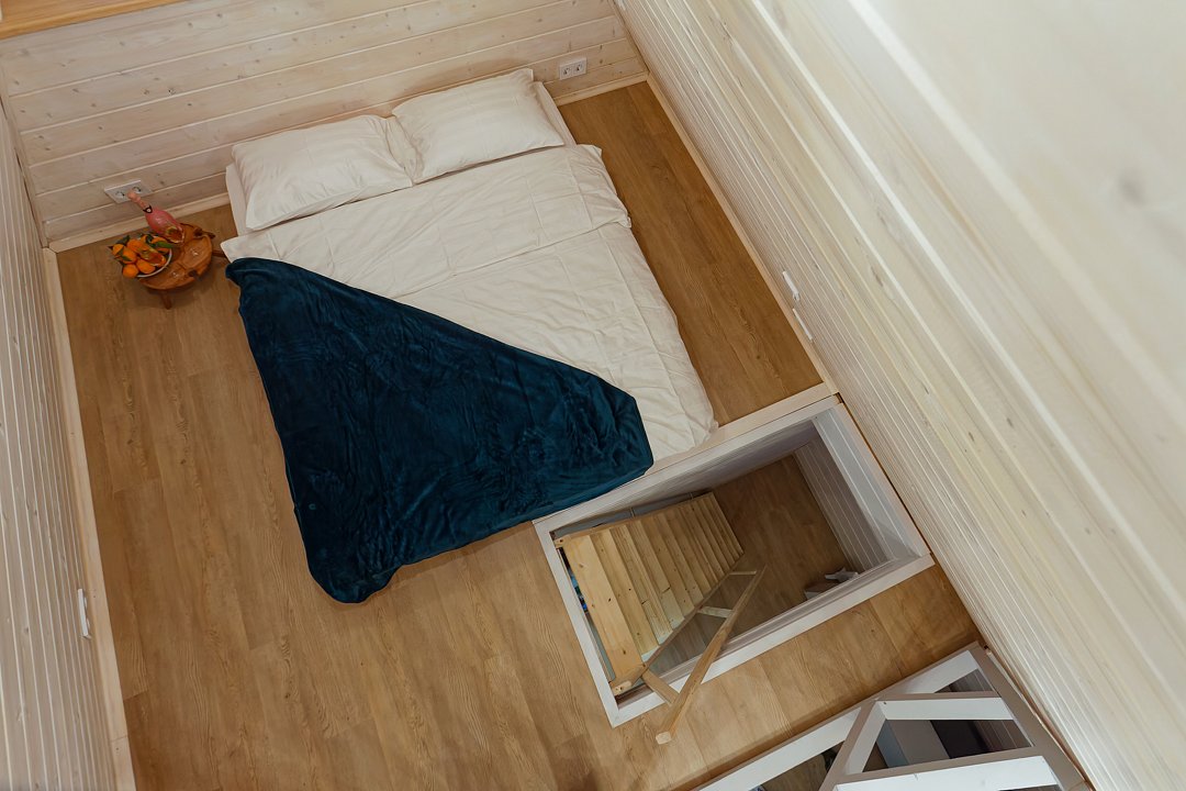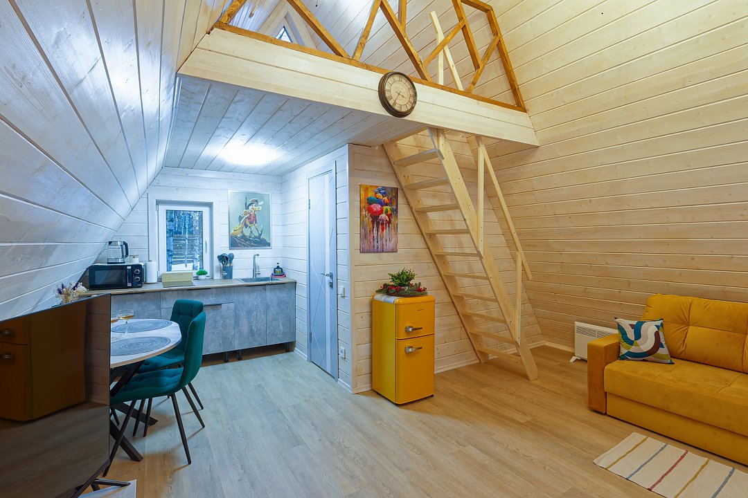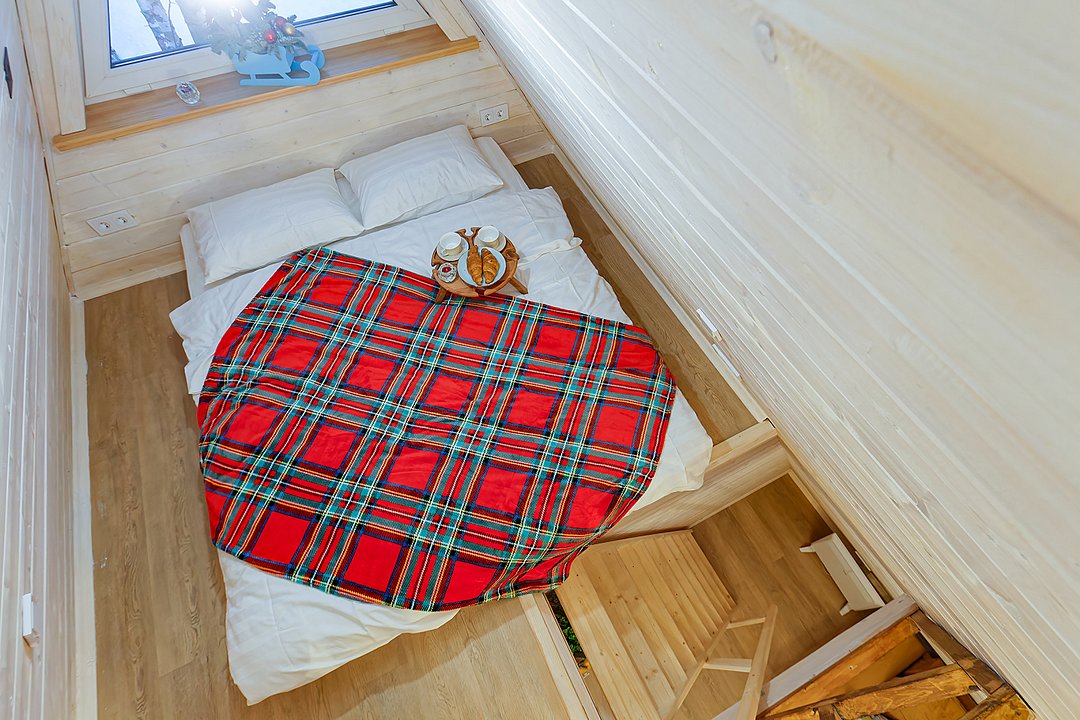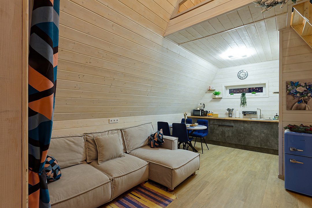 Размещение: Каждый домик рассчитан на 4 гостей. Наверху вас ждет комфортная спальня, а внизу, в просторной кухне-гостиной, предусмотрен удобный раскладной диван.