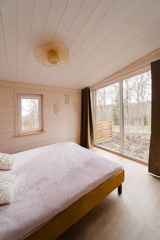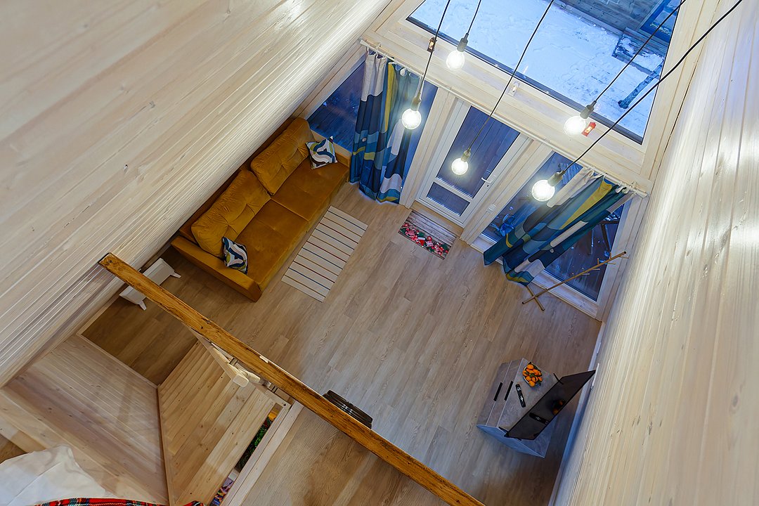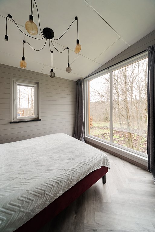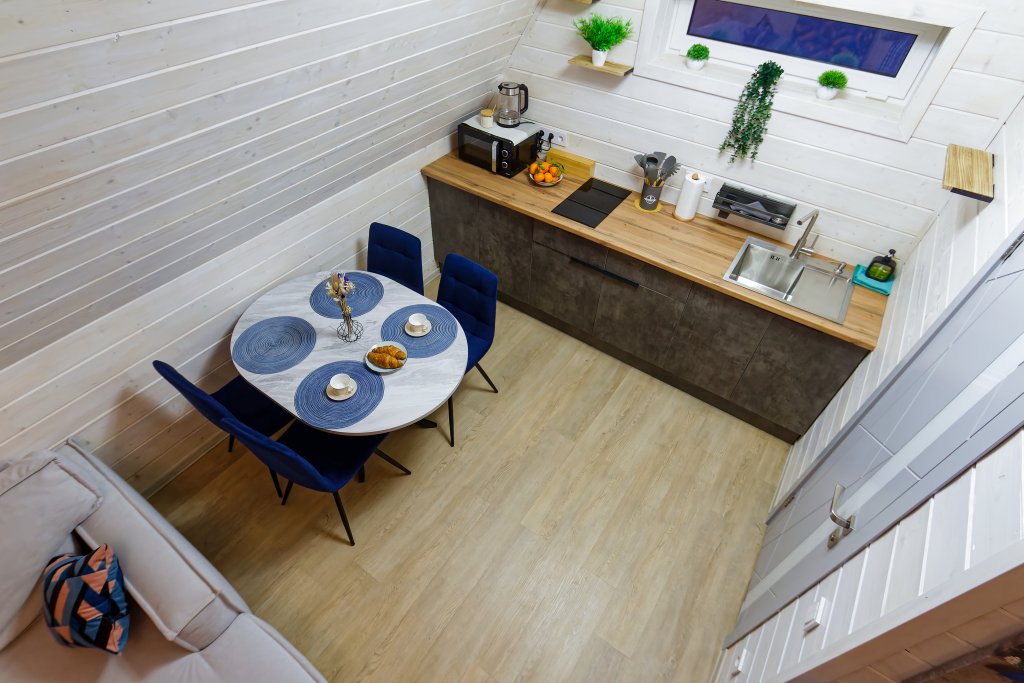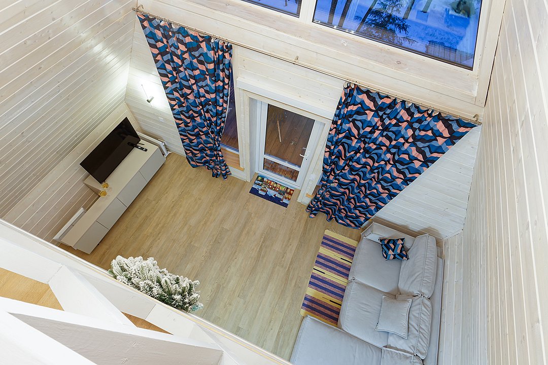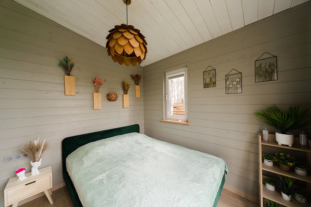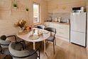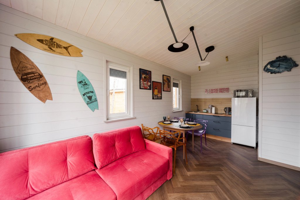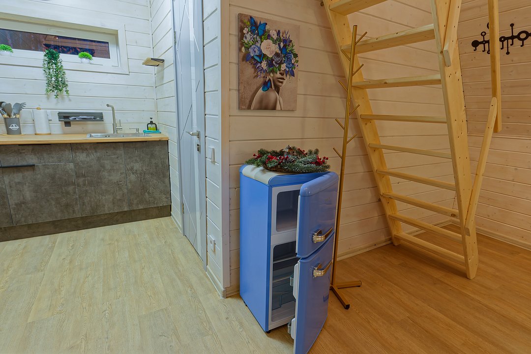 Размещение: Каждый домик рассчитан на 4 гостей. Наверху вас ждет комфортная спальня, а внизу, в просторной кухне-гостиной, предусмотрен удобный раскладной диван.