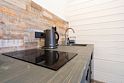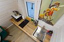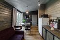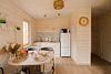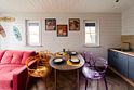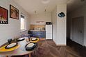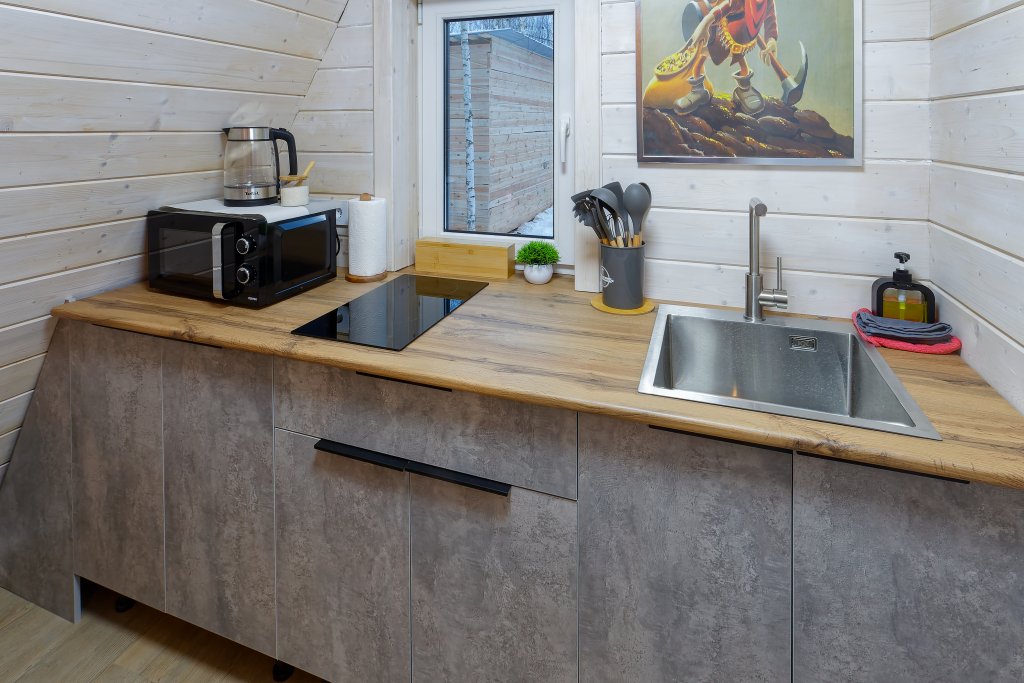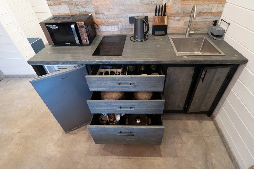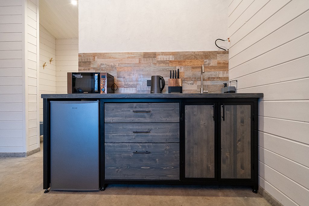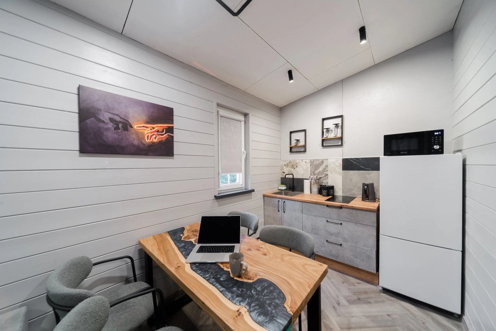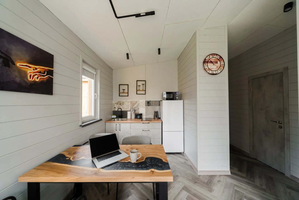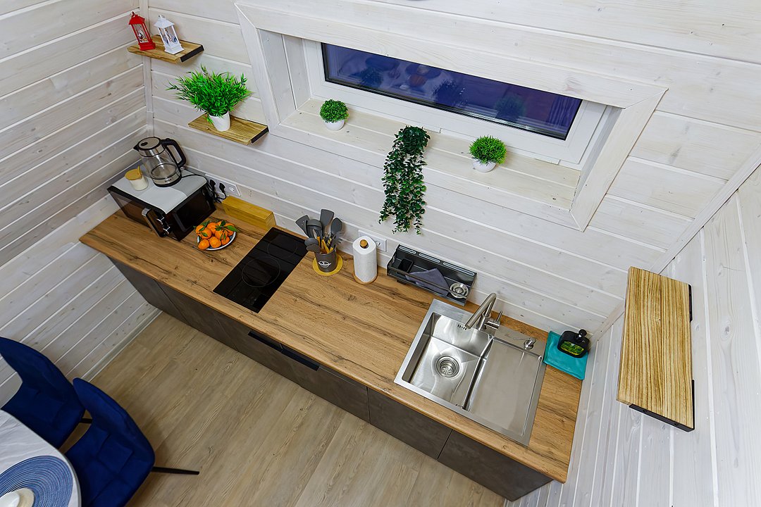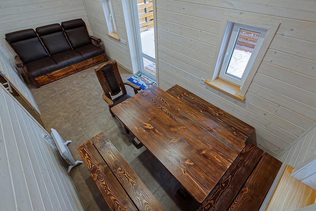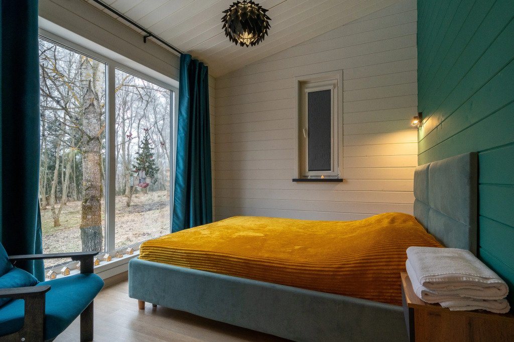 Размещение: Каждый домик рассчитан на 4 гостей. Наверху вас ждет комфортная спальня, а внизу, в просторной кухне-гостиной, предусмотрен удобный раскладной диван.