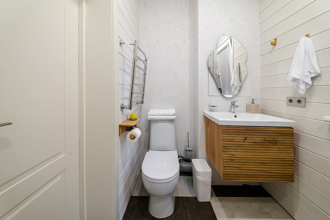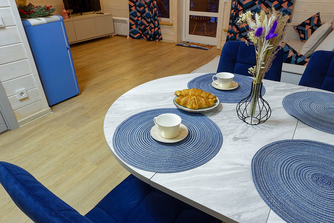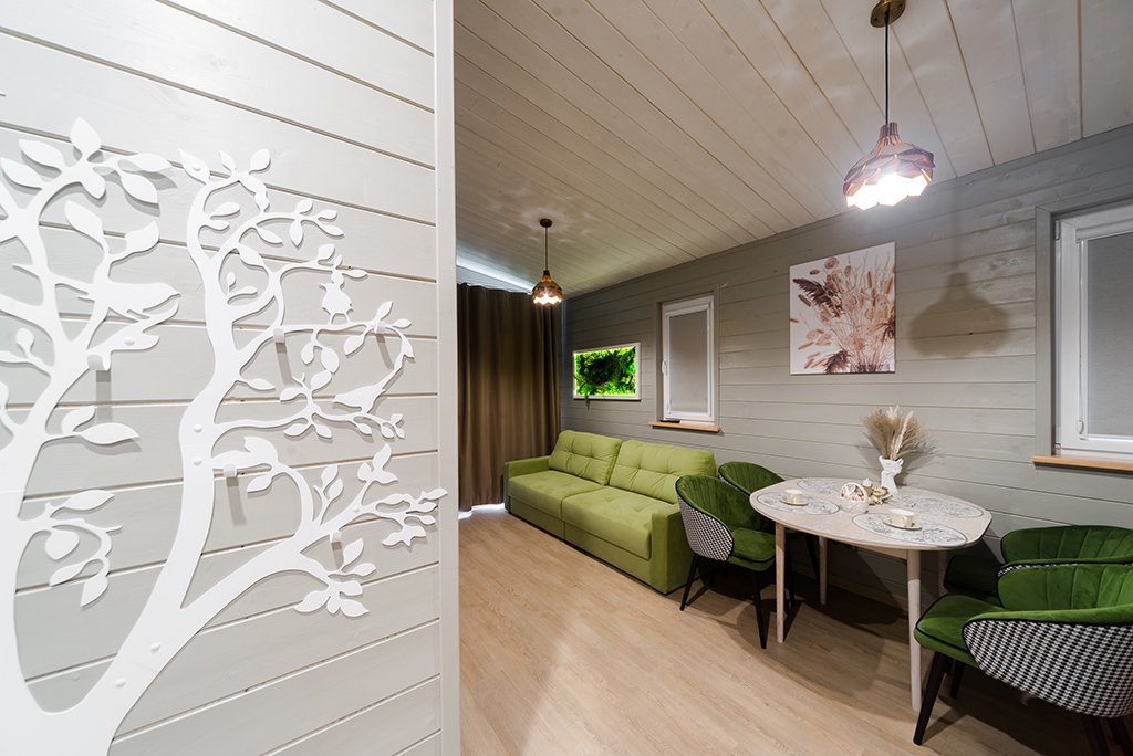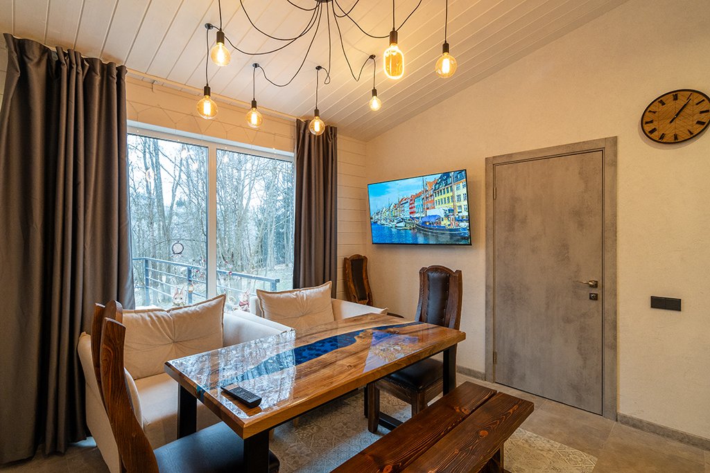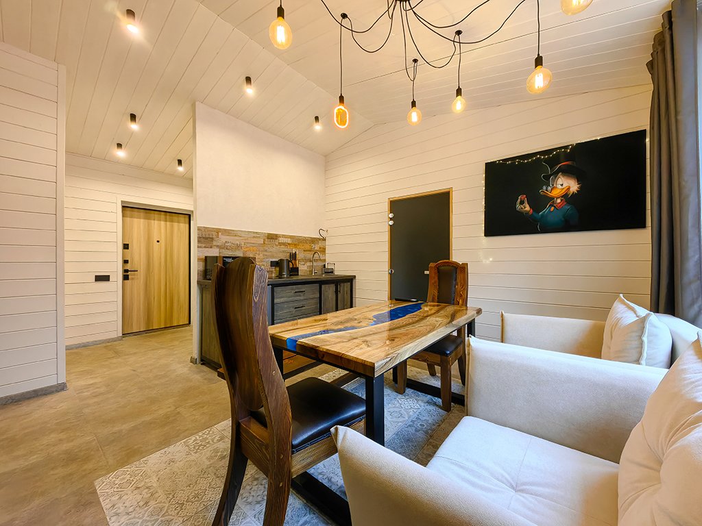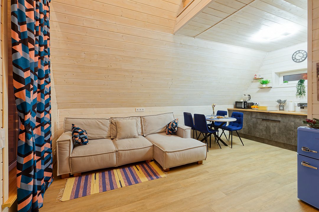 Просторная гостиная: Здесь вы найдете раскладной диван, который легко превращается в дополнительное спальное место для двух гостей. Это идеальное место для вечерних посиделок, настольных игр или просмотра любимых фильмов.