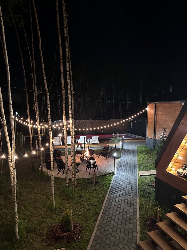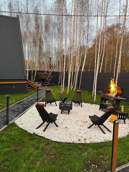 Проведите время за большим столом, расслабьтесь в кресле-качалке у камина или пожарьте на мангале свои любимые блюда. Соберитесь у костра и наслаждайтесь отдыхом в удобных креслах с бокалом в руке.