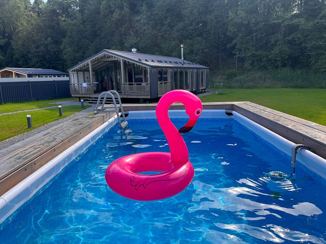 Во дворе дома «Chalet de ski» расположился бассейн, служащий оазисом прохлады в знойные дни. Рядом расположены изящные шезлонги, создающие атмосферу безмятежного отдыха под ласковыми лучами летнего солнца.