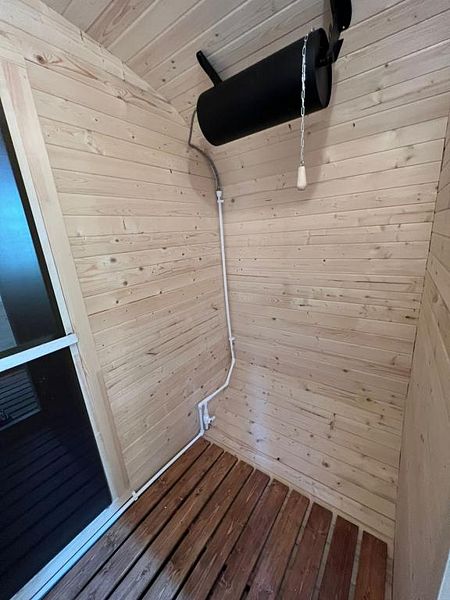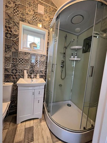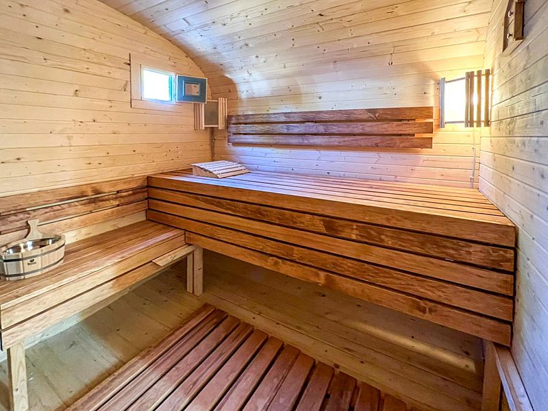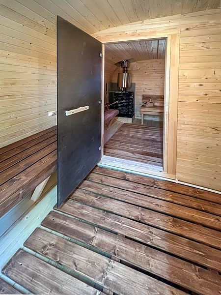 В доме имеется двуспальная кровать, зона с кухонным гарнитуром со всей необходимой посудой, холодильник, свч-печь, санузел с душем, Wi-Fi, своя баня, своя горячая купель с дровяным подогревом, зона для барбекю и печью для казана. Также около дома имеется небольшая лаунж-зона с креслами и костровой чашей. В светлое время суток там можно отдохнуть или позагорать летом, а в темное время организовать кинопоказ у костра.