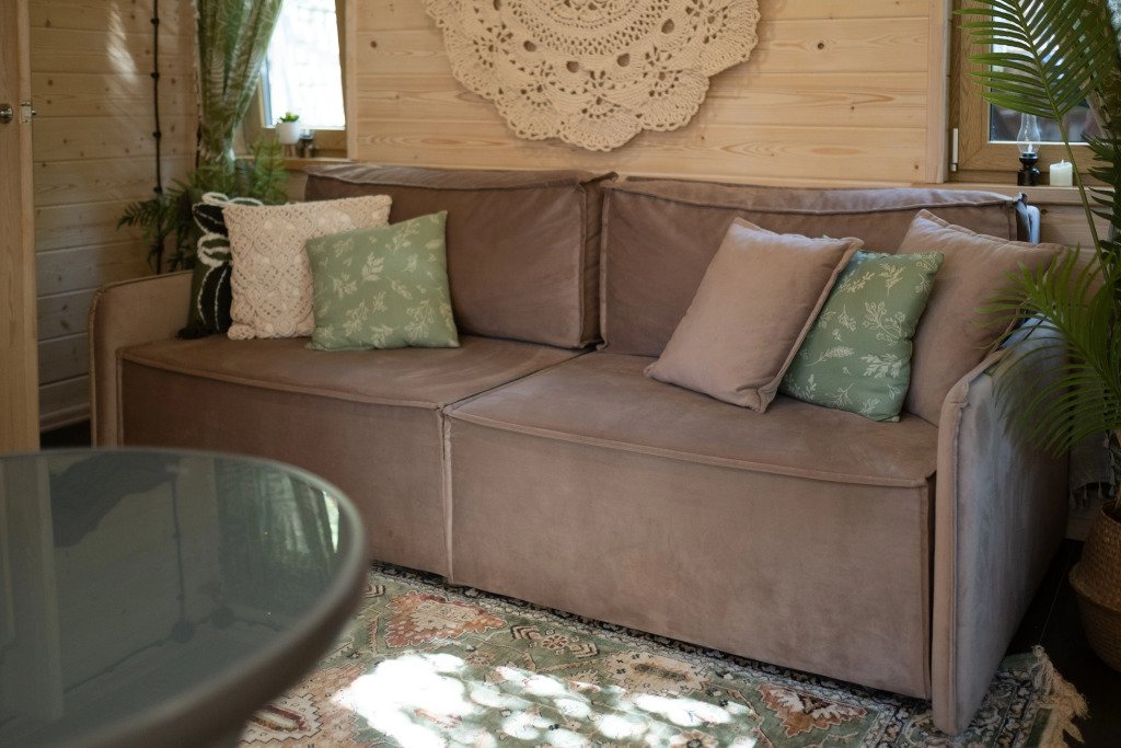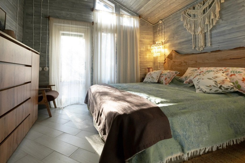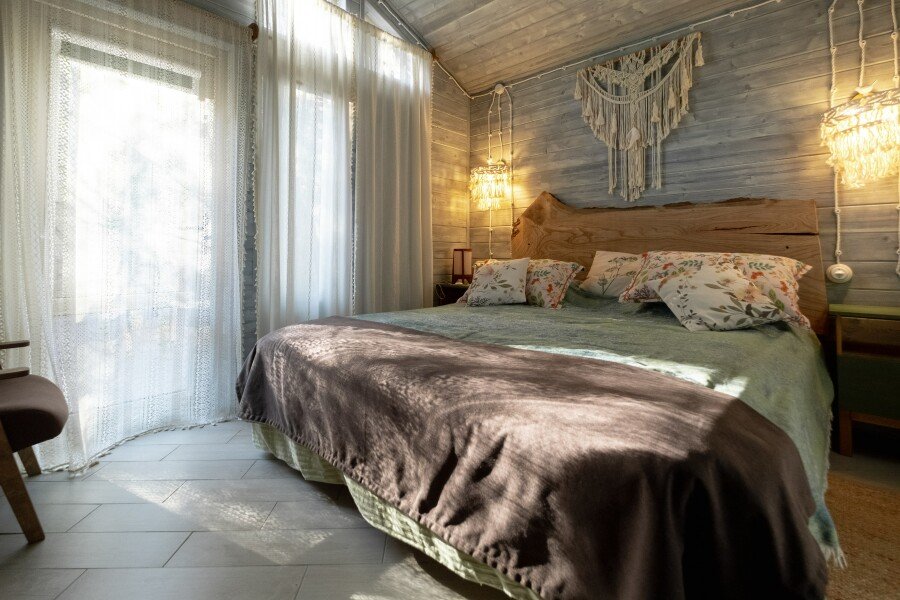 Авторская кушетка и деревянное изголовье кровати превращают дом в уютное пространство для души.