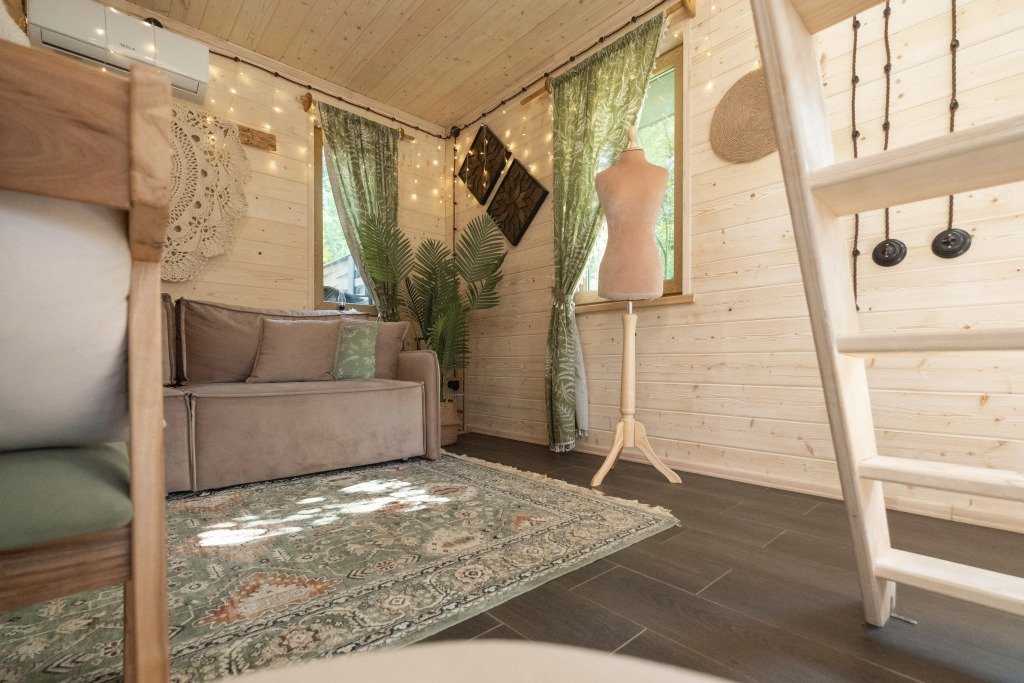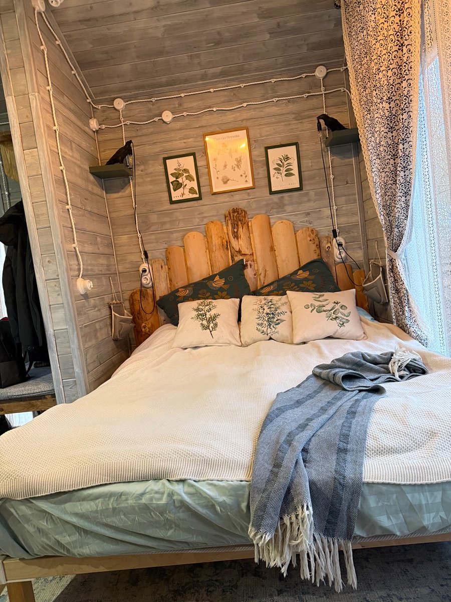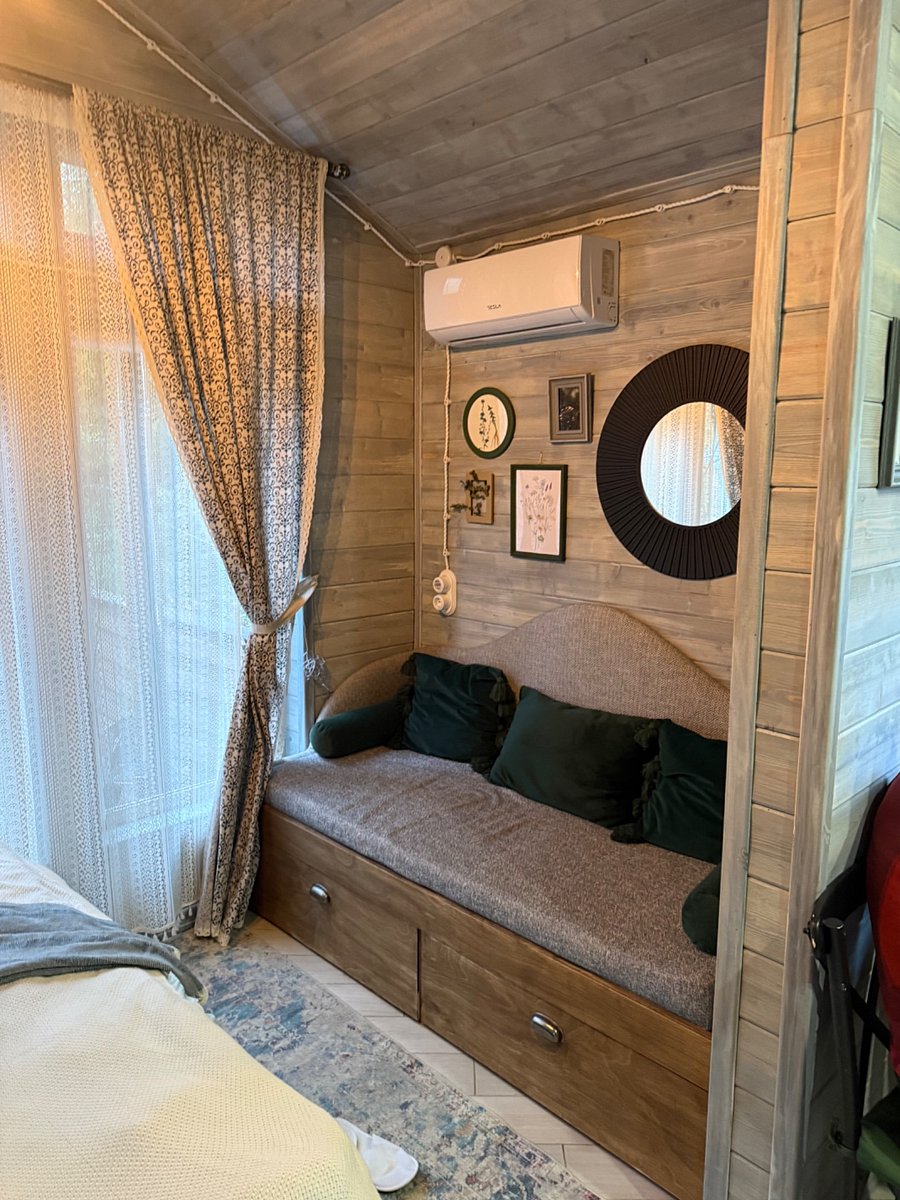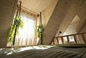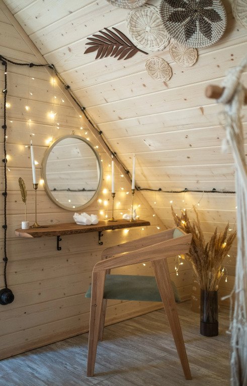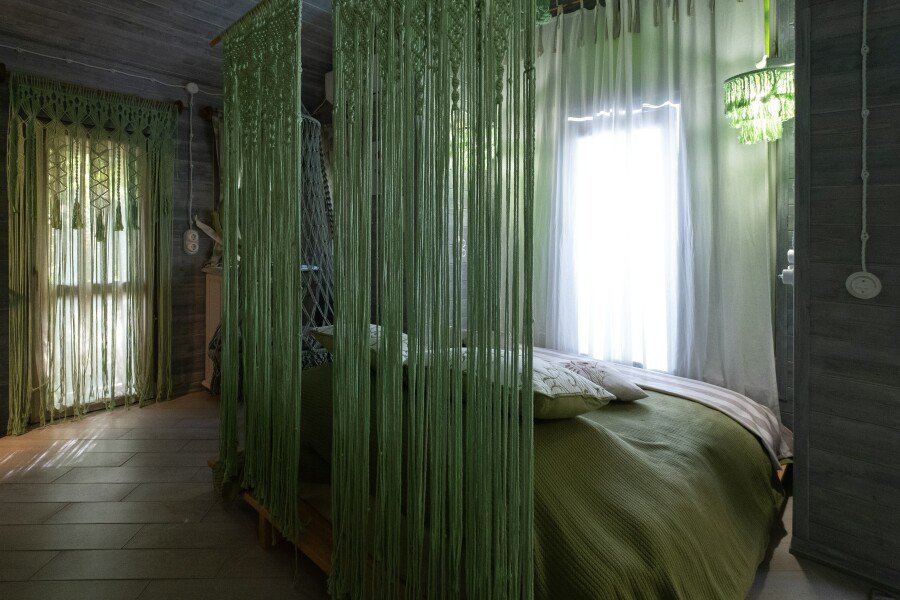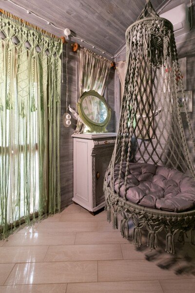 Панорамное окно открывает живописный вид на природу, а уютная кровать-татами, постеры с растительными мотивами и подвесное кресло приглашают расслабиться.