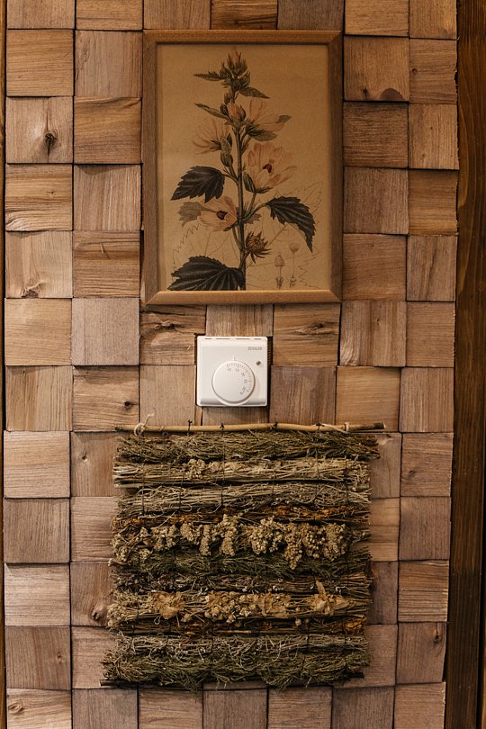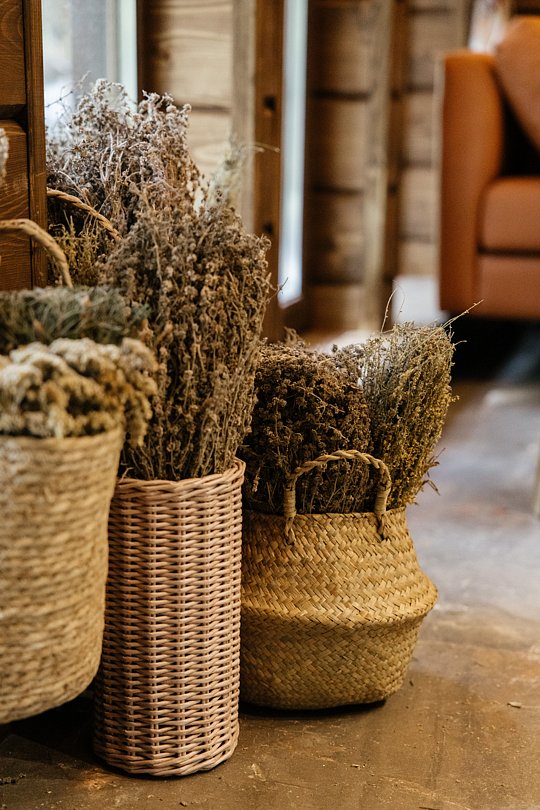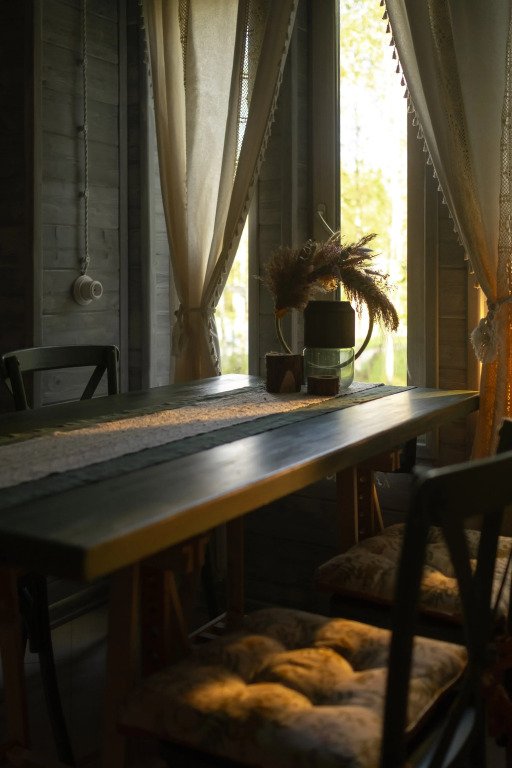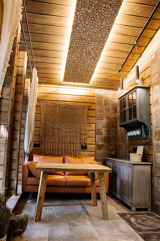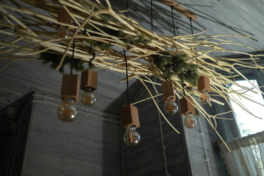 Авторские буфет и стол, дубовый слэб, люстра из веток и флористические панно наполняют пространство природной свежестью.