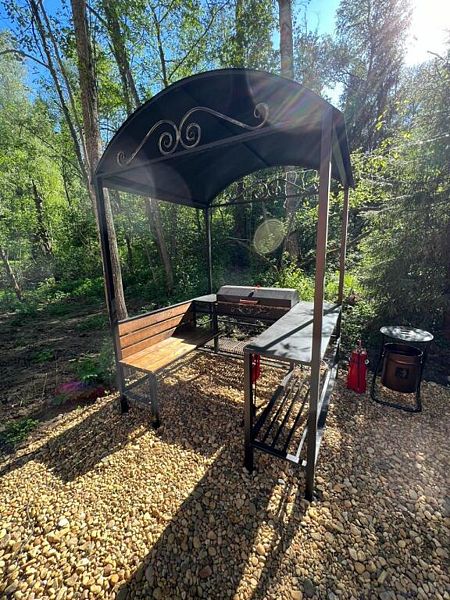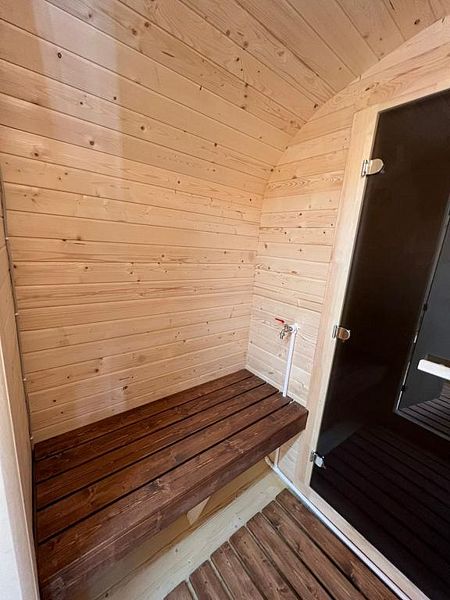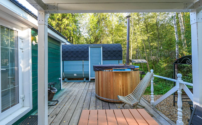 В доме имеется двуспальная кровать, зона с кухонным гарнитуром со всей необходимой посудой, холодильник, свч-печь, санузел с душем, Wi-Fi, своя баня, своя горячая купель с дровяным подогревом, зона для барбекю и печью для казана. Также около дома имеется небольшая лаунж-зона с креслами и костровой чашей. В светлое время суток там можно отдохнуть или позагорать летом, а в темное время организовать кинопоказ у костра.