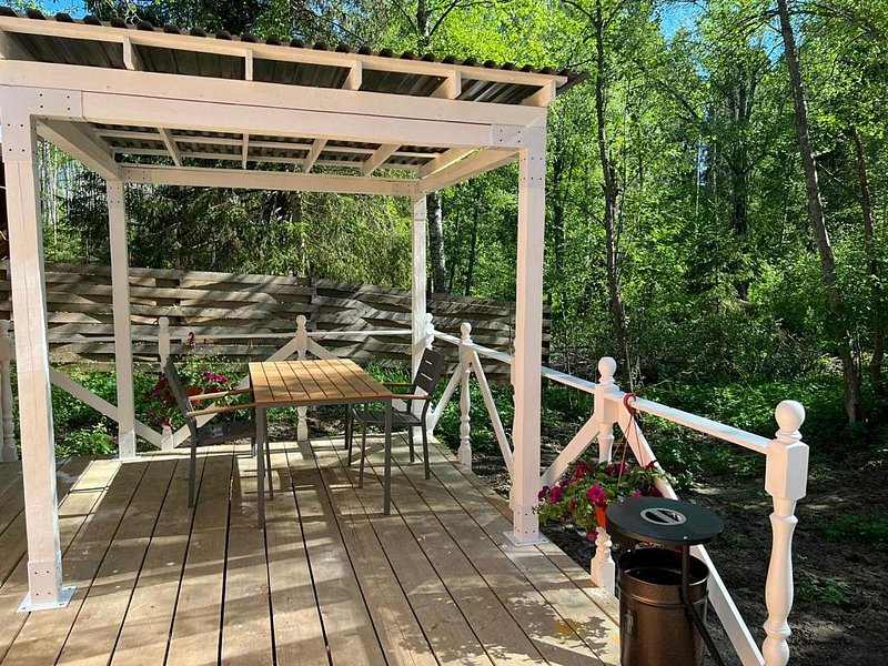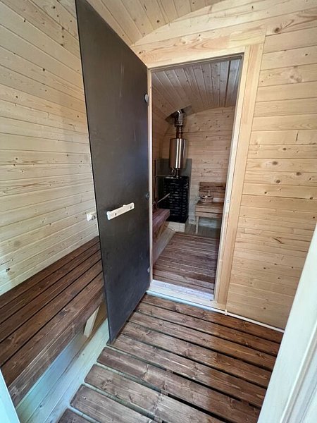 В доме имеется двуспальная кровать, зона с кухонным гарнитуром со всей необходимой посудой, холодильник, свч-печь, санузел с душем, Wi-Fi, своя баня, своя горячая купель с дровяным подогревом, зона для барбекю и печью для казана. Также около дома имеется небольшая лаунж-зона с креслами и костровой чашей. В светлое время суток там можно отдохнуть или позагорать летом, а в темное время организовать кинопоказ у костра.