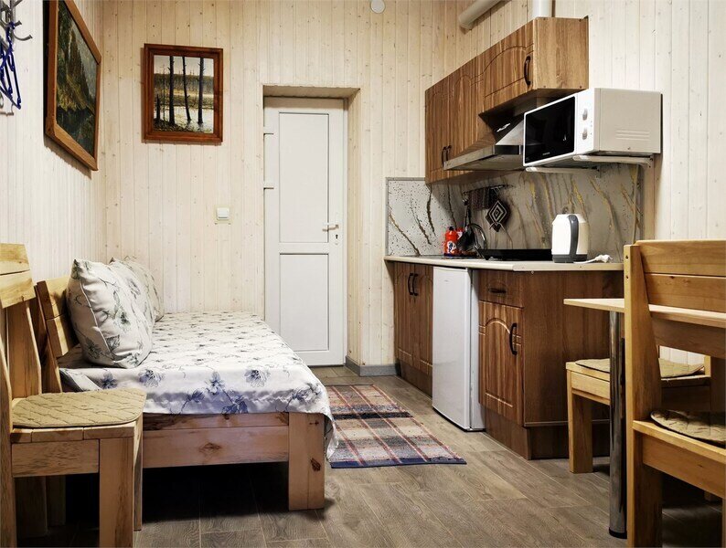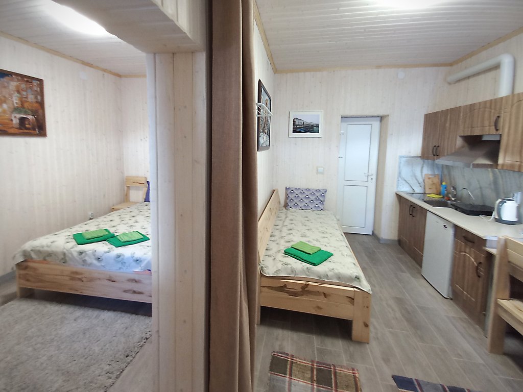 Однокомнатные апартаменты с собственной кухней и санузлом. Возможно размещение до 5 человек. Отдельный вход. Из окна вид на пруд. Также в распоряжении гостей: общая кухня, гостиная, душевые, сан.узлы. Сауна, баня, прачечная, сушка белья, мангалы -оплачиваются дополнительно.