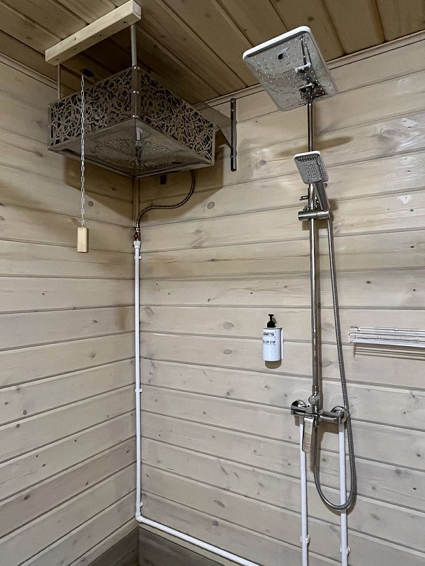 Горячий душ, обливное устройство с ледяной водой из скважины после жаркой парилки охладит и придаст энергии, парилка.