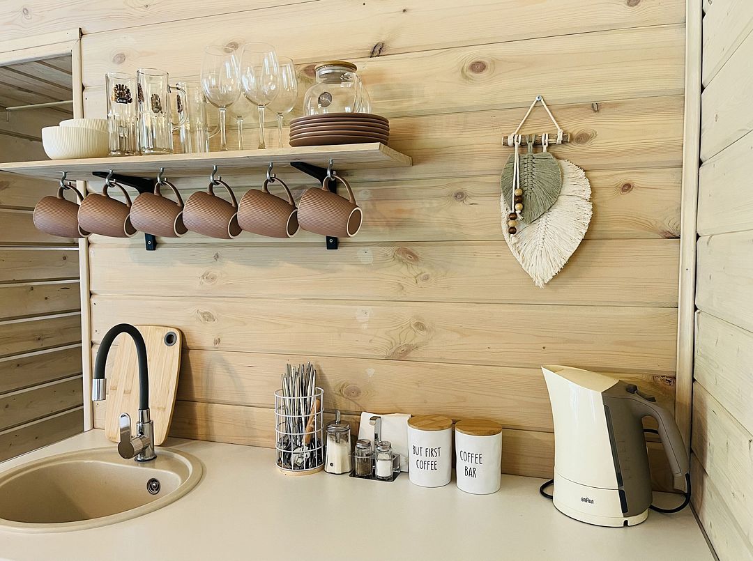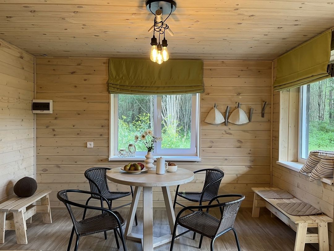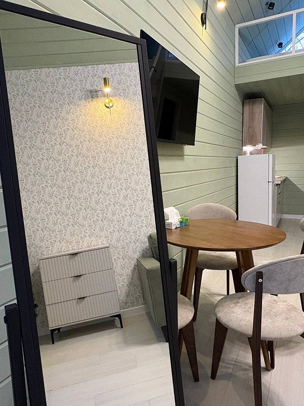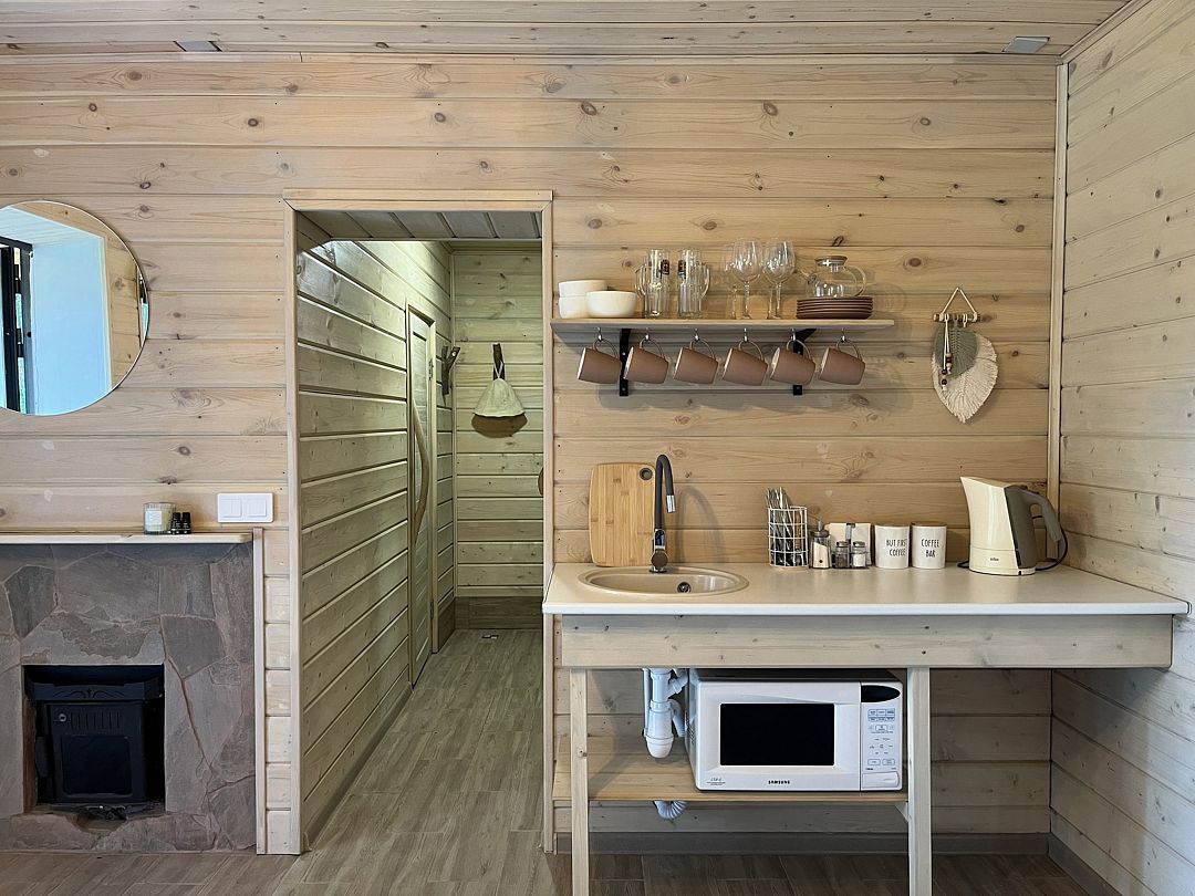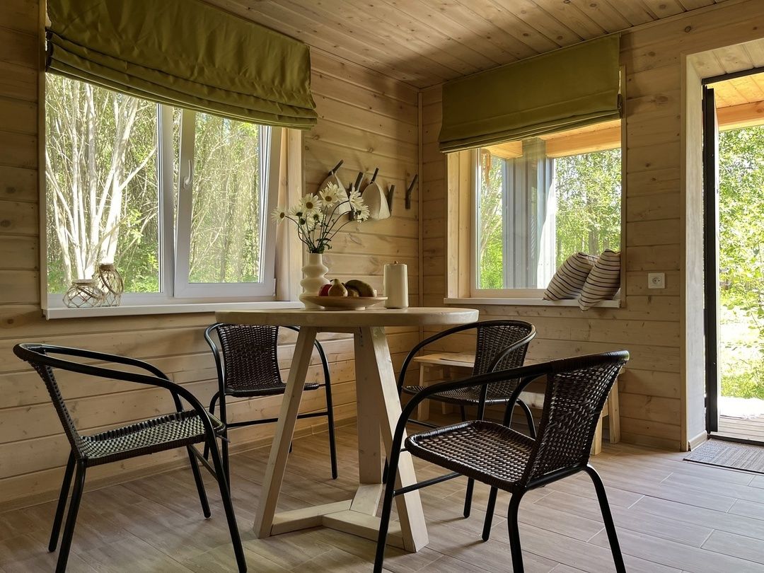 Стильные и уютные домики оснащены всеми необходимыми мелочами, которые позволят Вам отдохнуть и насладиться тишиной и размеренной загородной жизнью, не покидая пределы города. Возможна доставка продуктов из магазина «ВкусВилл».