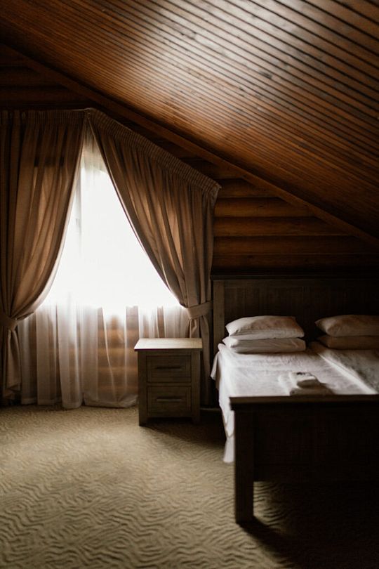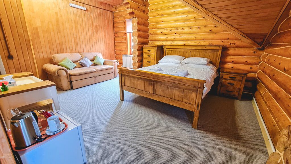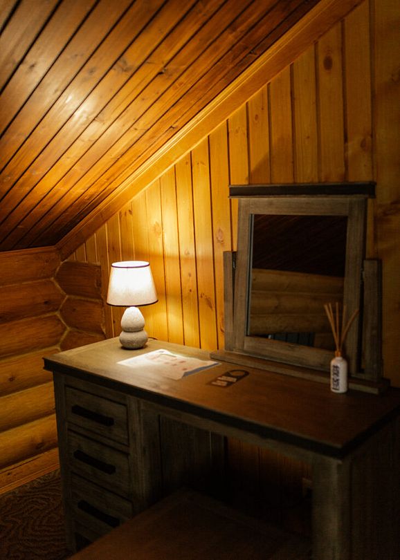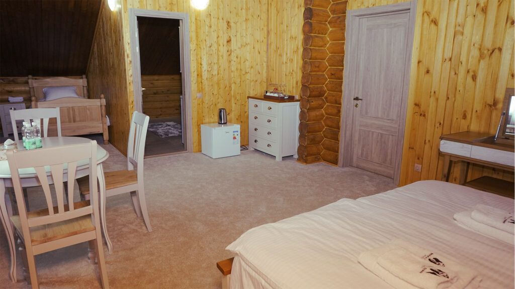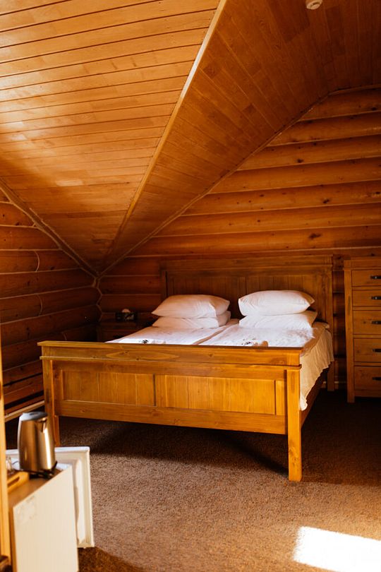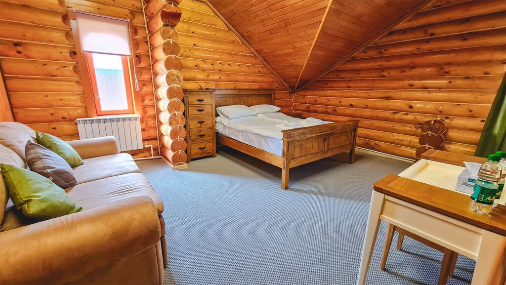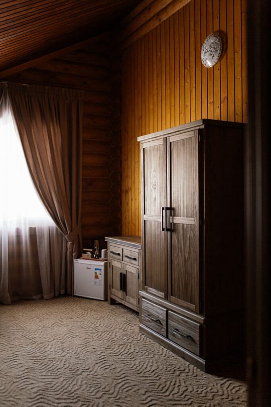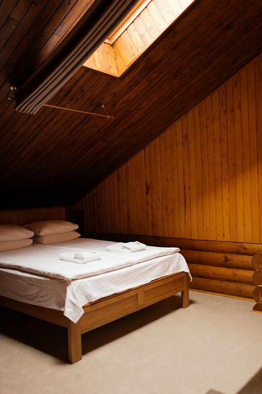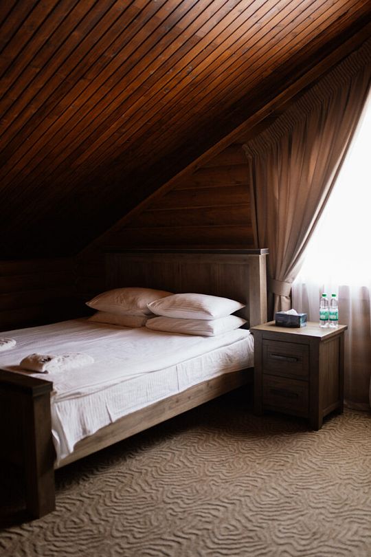 Номер расположен в мансарде Основного корпуса — это трёхместный семейный номер с видом на тайгу.