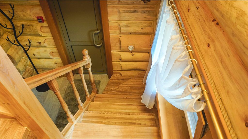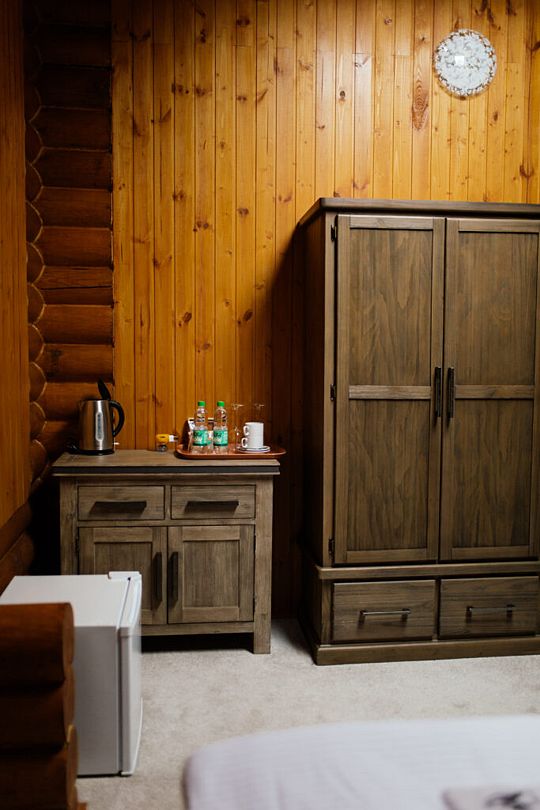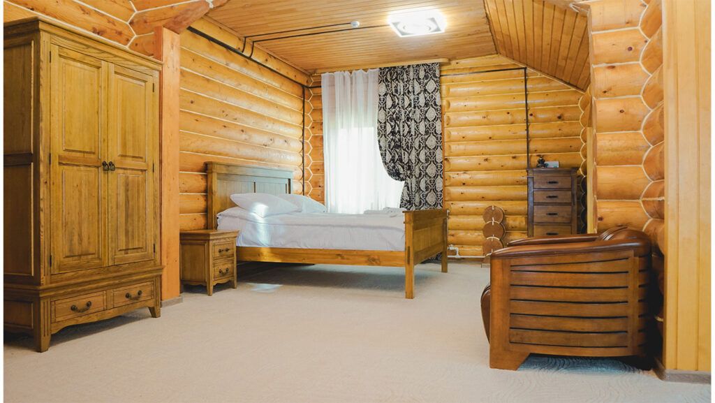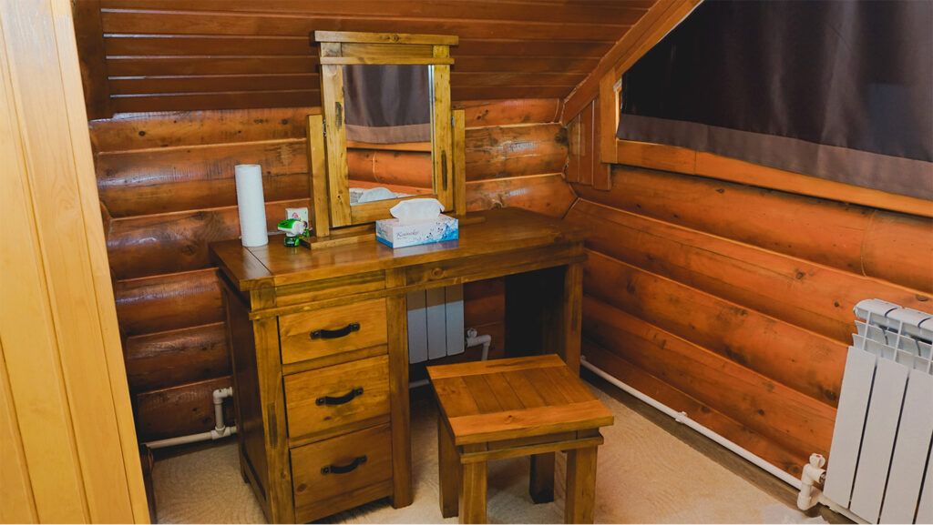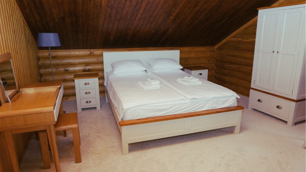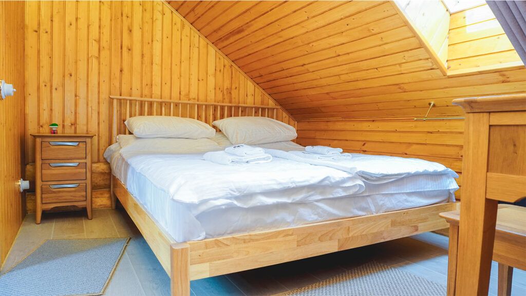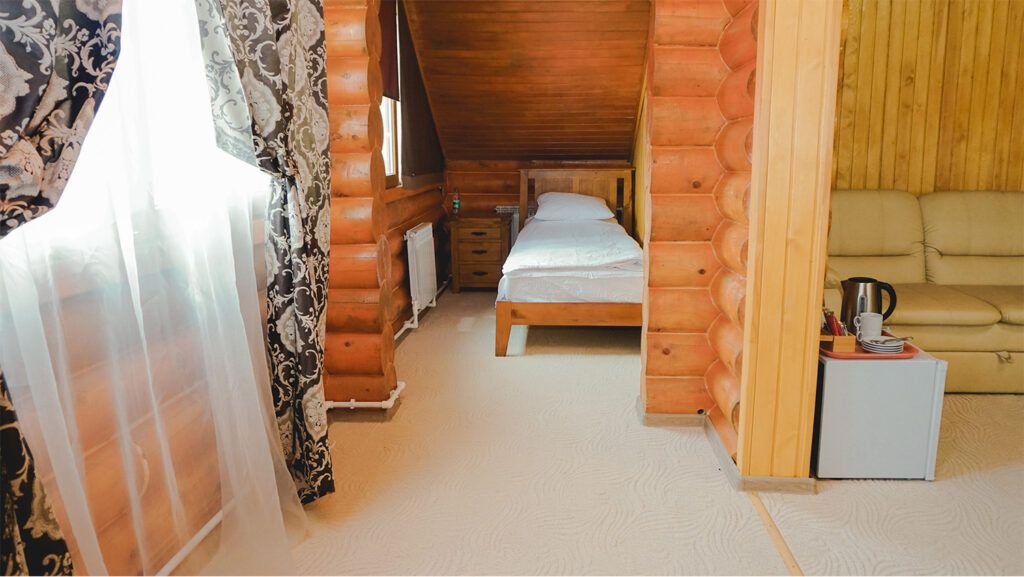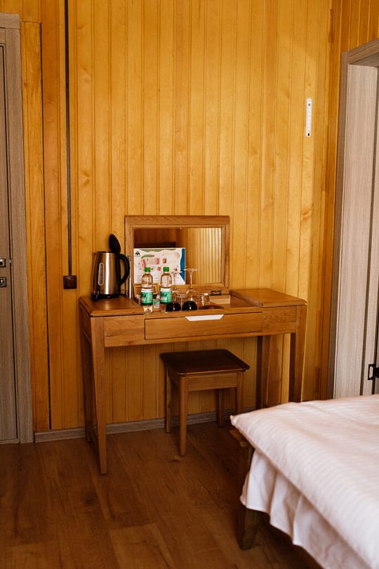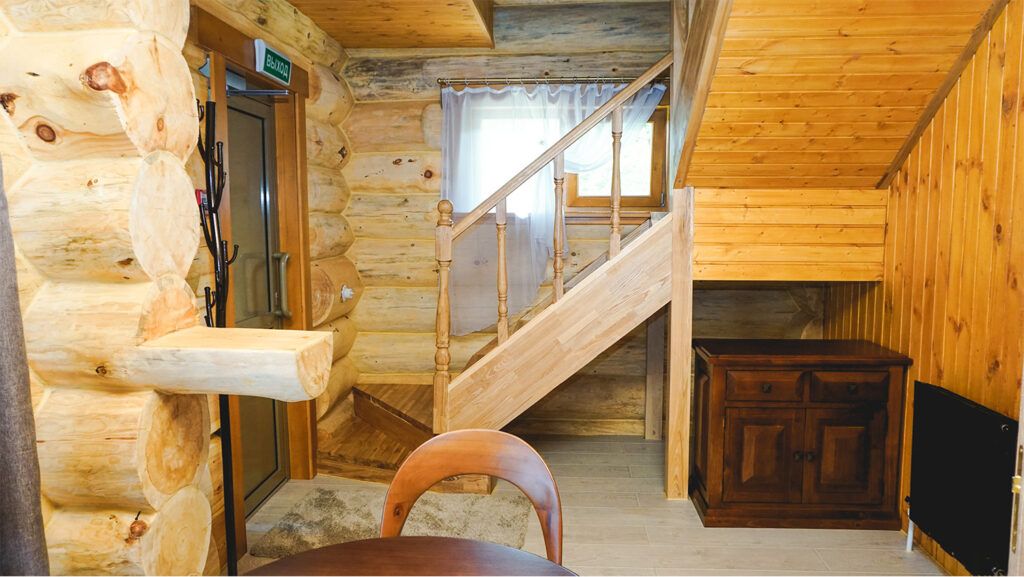 Номер расположен в мансарде Основного корпуса — это трёхместный семейный номер с видом на тайгу.