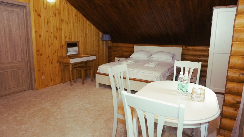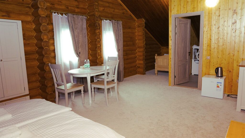 Роскошный номер с обеденной зоной, гостиной с русской печью, лаундж зоной под крышей.