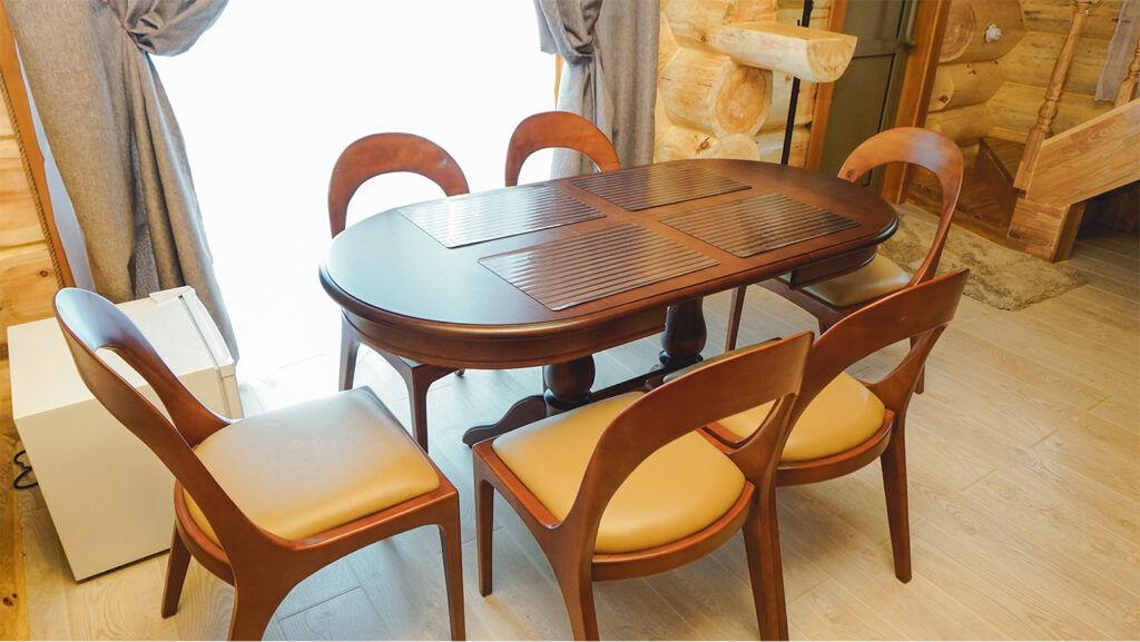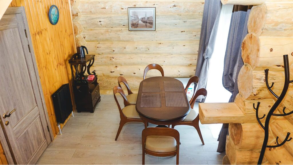 Большая баня может использоваться в качестве банкетного зала для 12 персон, так как она поделена на парную и обеденную зоны, где гости могут собраться на торжество за большим дизайнерским столом.