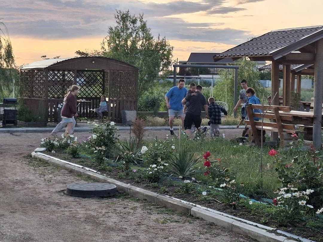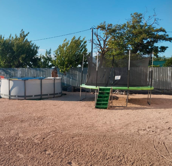 Большой закрытый двор с бассейном, беседками, мангалами, батутом, качелями, игровой зоной для малышей.