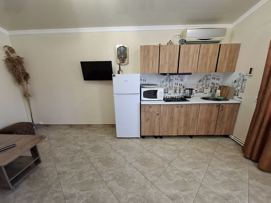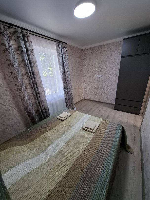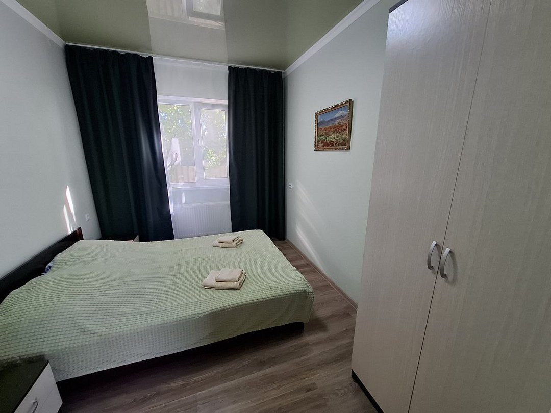 В номере: одна двуспальная кровать, большой раскладной диван, холодильник, микроволновка, кондиционер, плита, посуда, постель, полотенца, телевизор, чайник, Wi fi. Стиральная машина и гладильные принадлежности на территории, общего пользования.