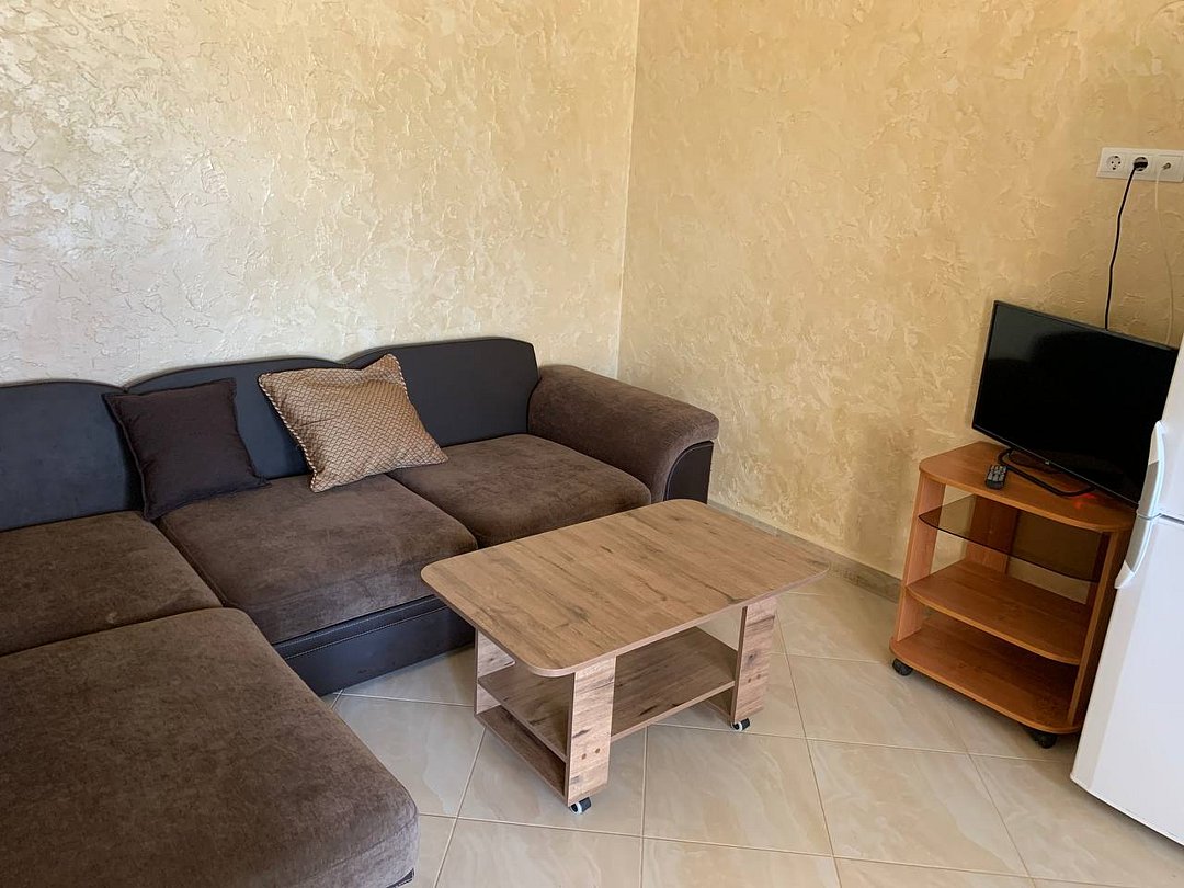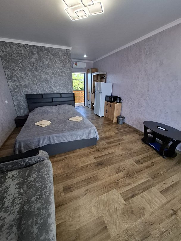 В номере: двуспальная кровать, раскладной диванчик, столик, стулья, холодильник, кондиционер, посуда, постель, полотенца, телевизор, чайник, WI fi.