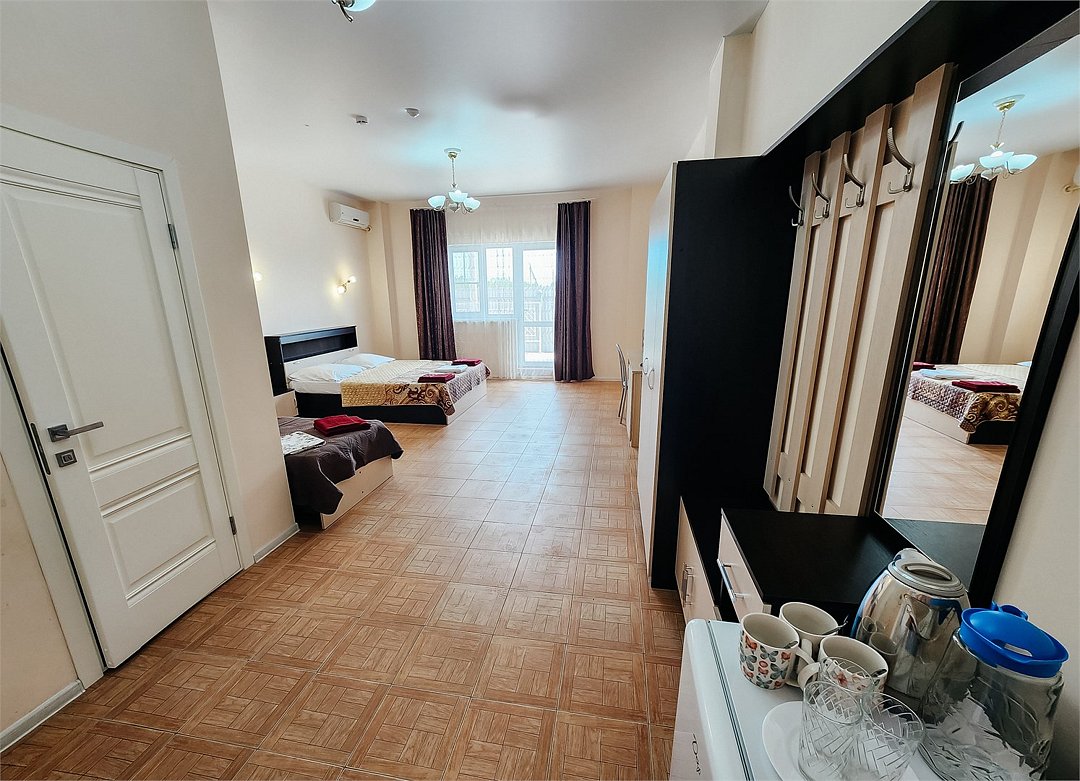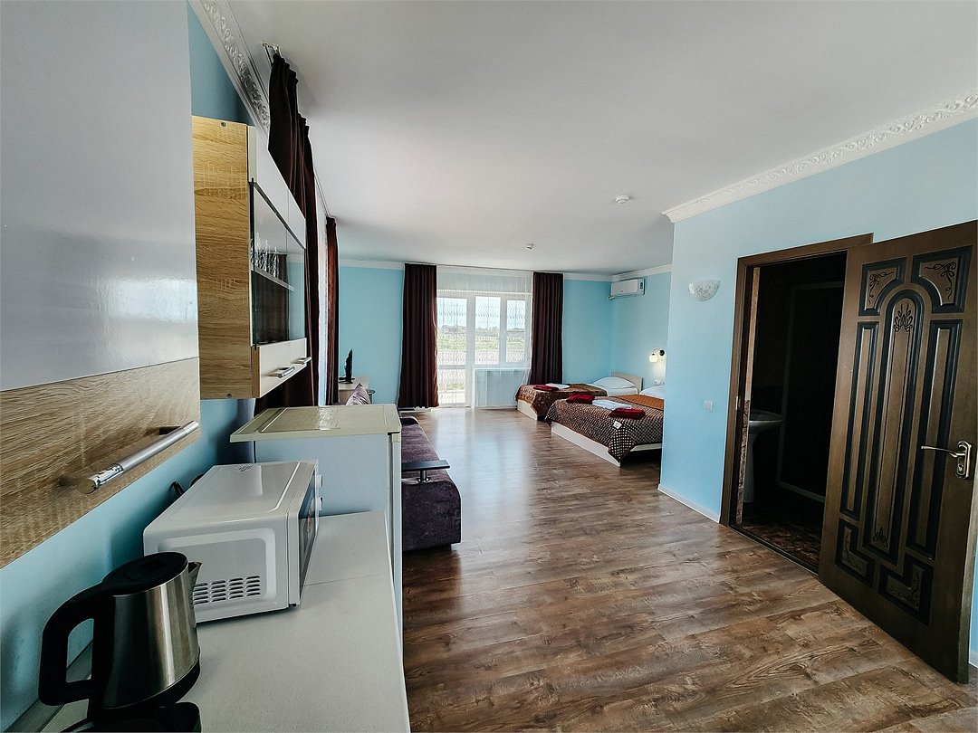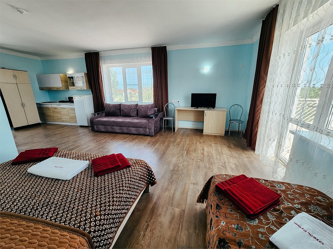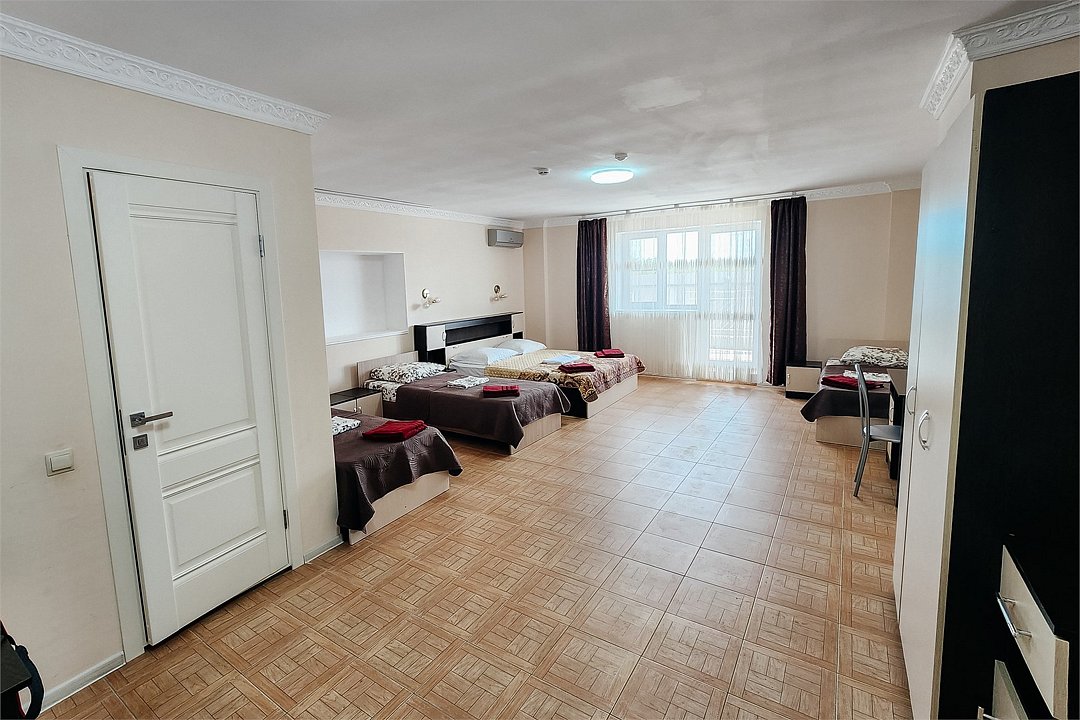 Комфортный четырёхместный номер. В номере есть мини-кухня без плиты, большая лоджия с уличной мебелью.Услуги и удобства
