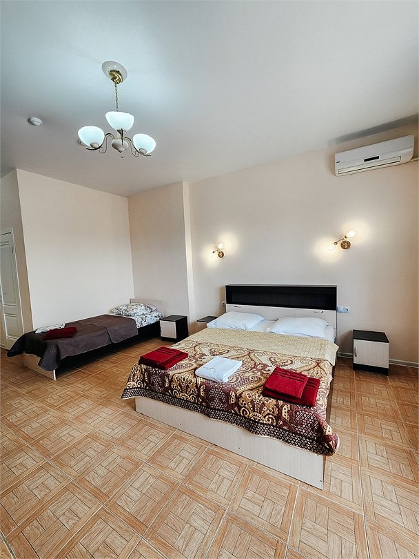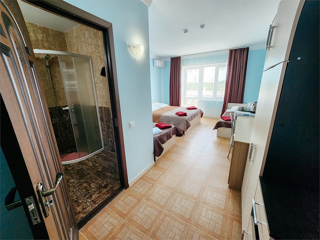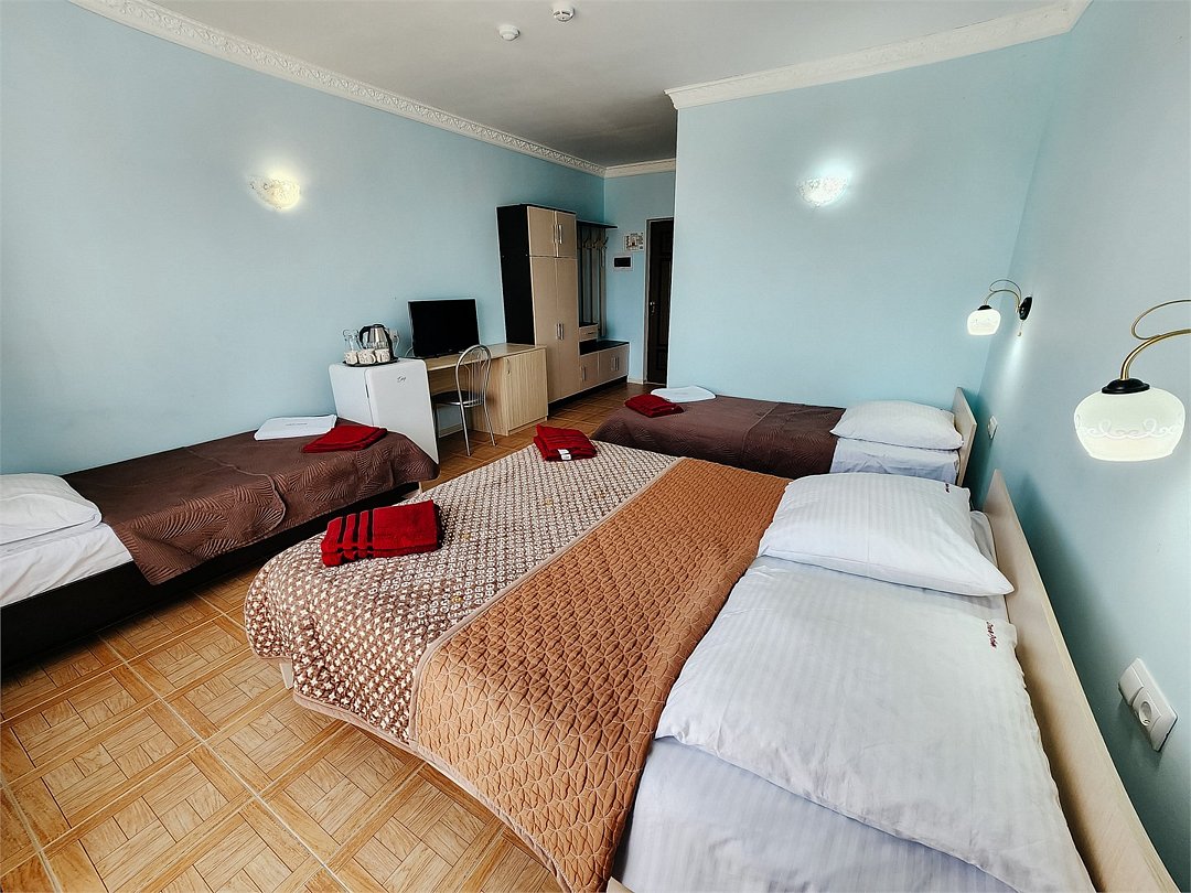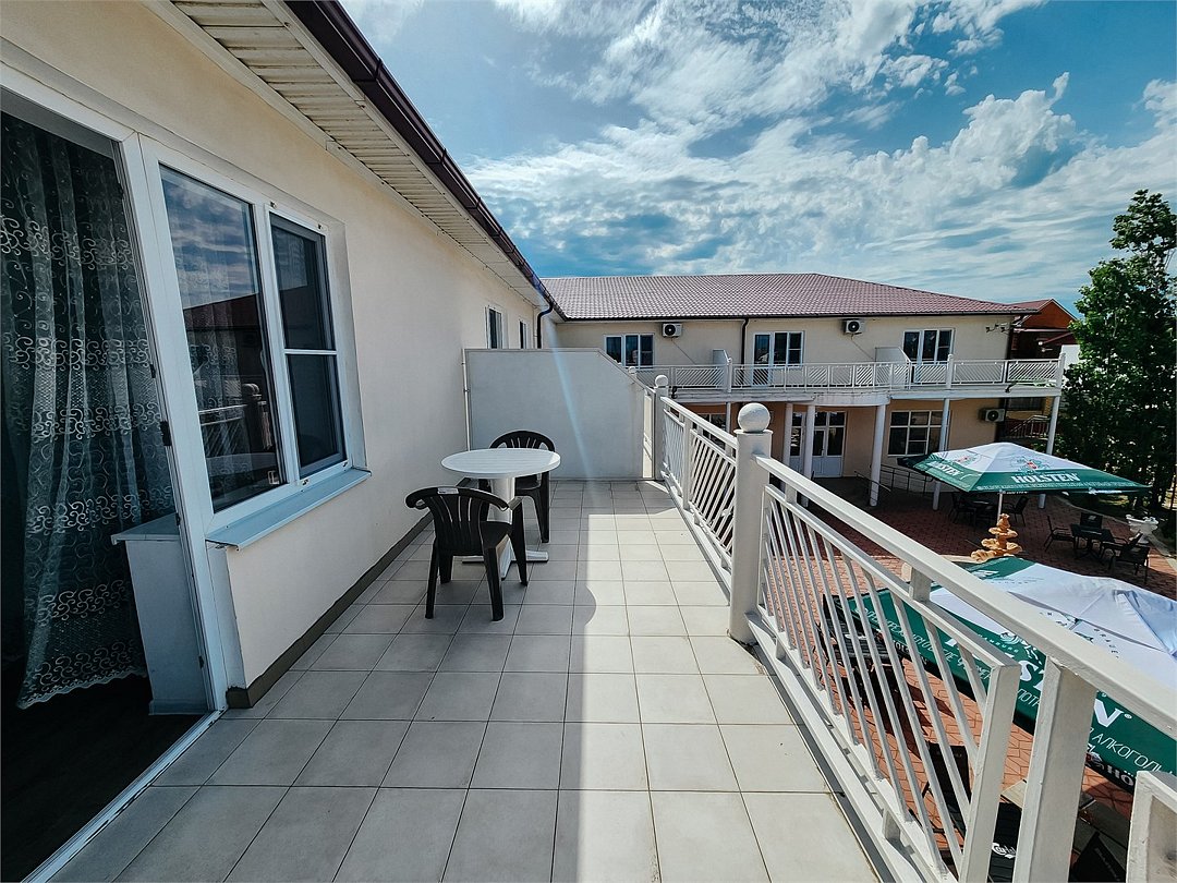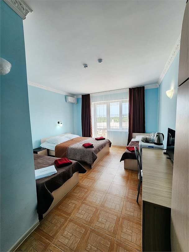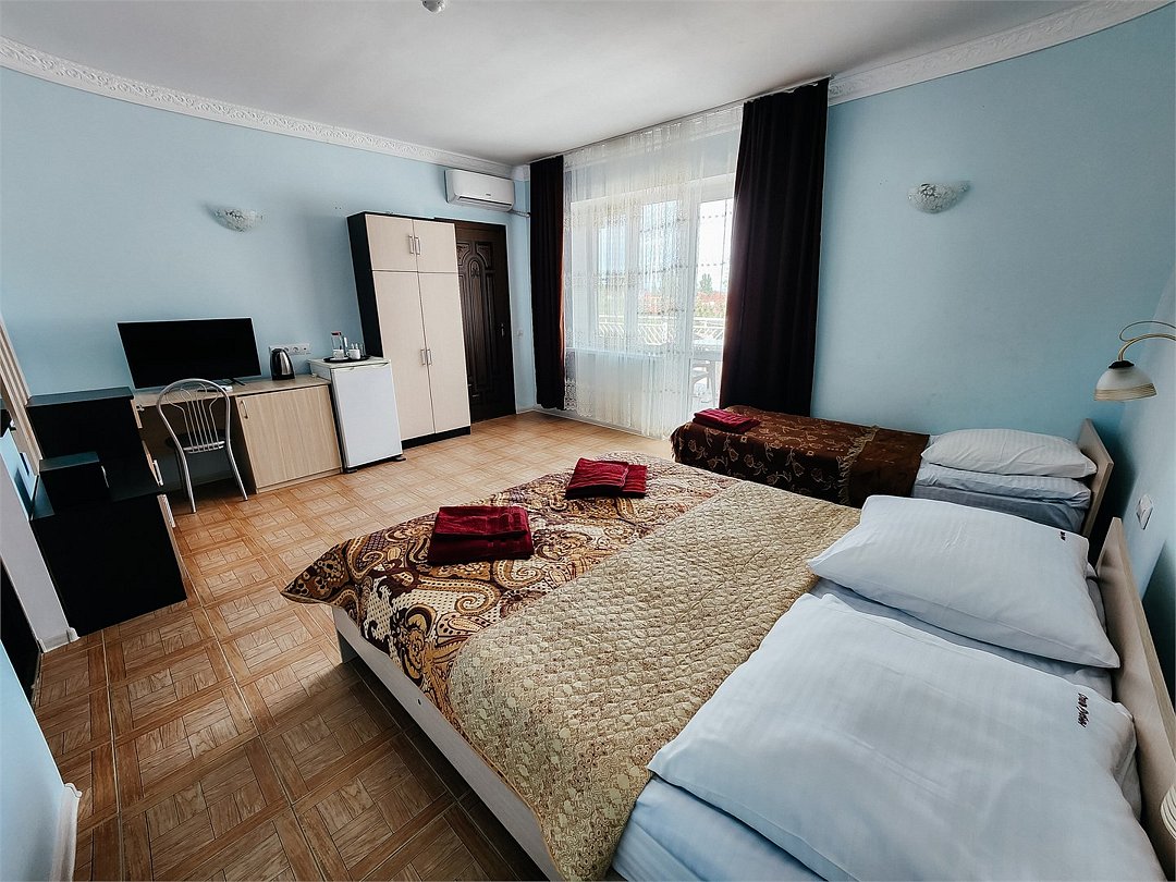 Стандартный номер на троих, возможно дополнительное место в виде комфортной раскладной кровати. Второй этаж, вид на море. В номере всё необходимое для комфортного проживания, а также большая лоджия с уличной мебелью.Услуги и удобства