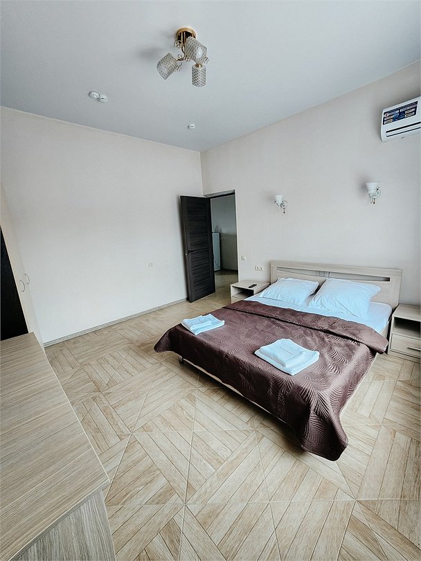 Wi-Fi, холодильник, кондиционер, светильник, фен, плита для приготовления пищи, микроволновая печь, душевая кабина, санузел, водонагреватель, банные полотенца, тапочки, лоджия, кровать «King size», диван, тумбы, стулья, шкаф для одежды, вешалки, обеденный стол, зеркало, мебельный гарнитур, две комнаты, кухня, чайный набор, набор посуды, чайник, унитаз, раковина, обеденная зона, гостиная зона, отдельный вход в номер, плиточное покрытие, кресло, вид во двор, кухонная посуда, стаканы, кухонная утварь, столовые приборы, стул, стол, тумба, туалетные средства, туалет, сплит-система, мангал, сушилка для белья, цифровое тв, раскладной диван, москитная сетка, номер для некурящих, рабочий стол, оснащение для гостей с ограниченными возможностями, кресло-кровать, двуспальный раскладной диван-кровать, межкомнатная дверь, набор для приготовления чая и кофе, вешалки-плечикиВ номере