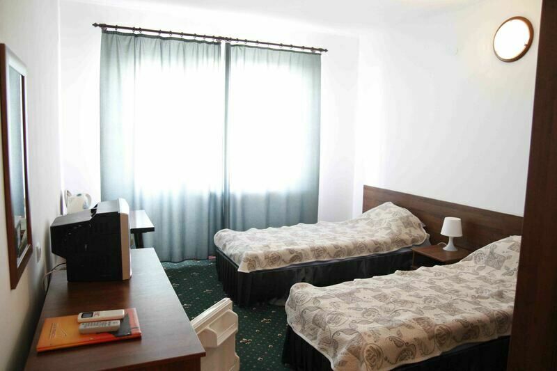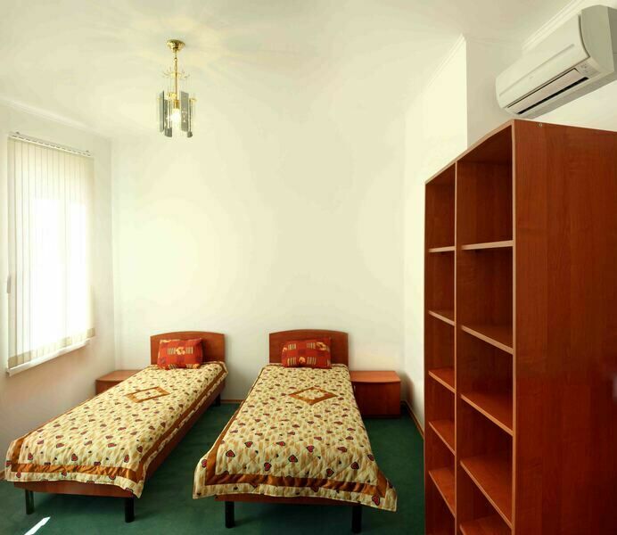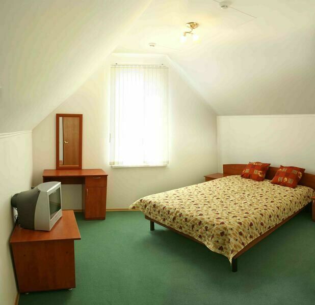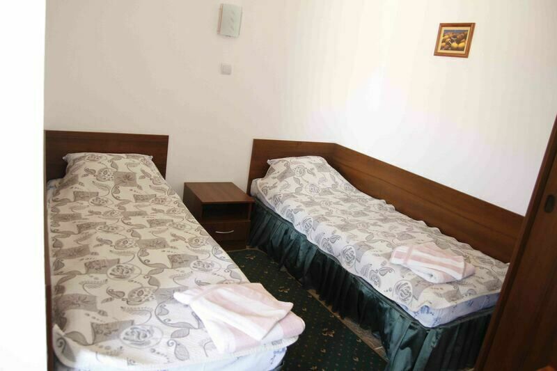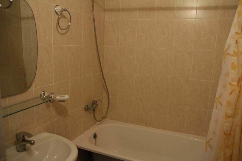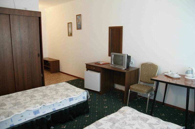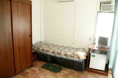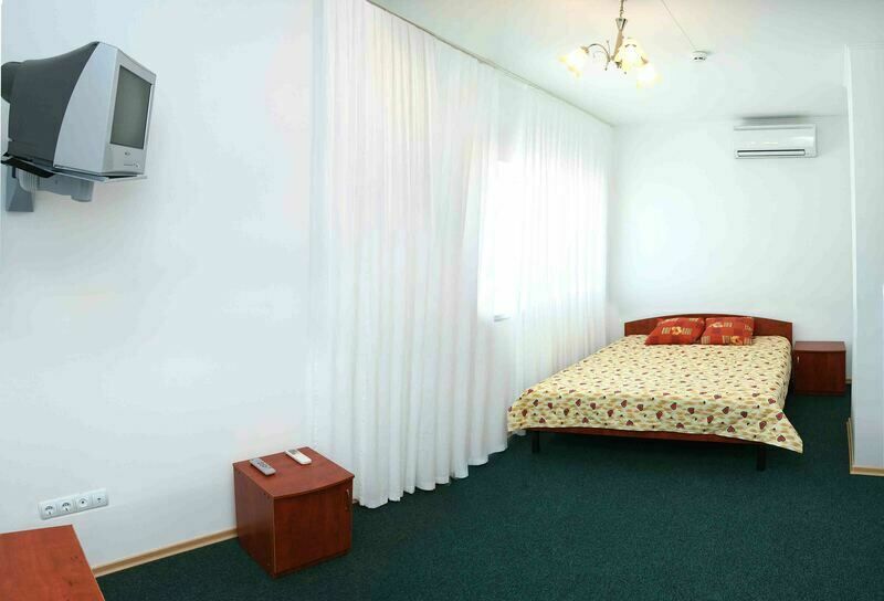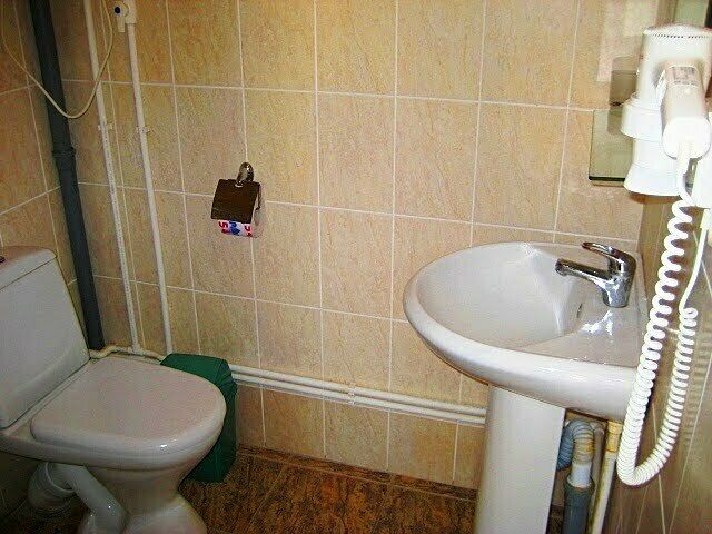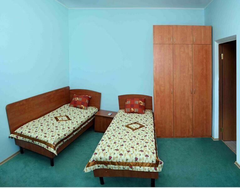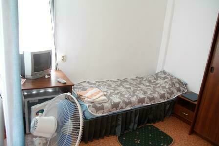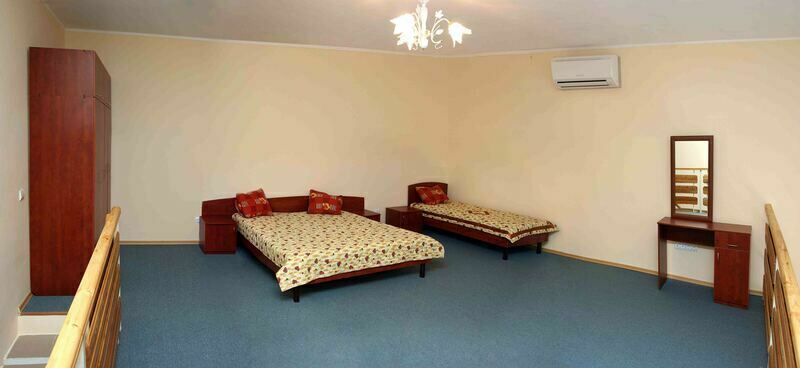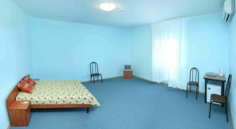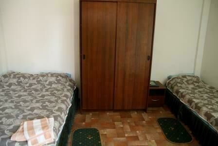 Номер на 3-м этаже состоит из большой спальни, прихожей и совмещенного санузла. В спальне на полу лежит ковролин, в прихожей и санузле — кафель.