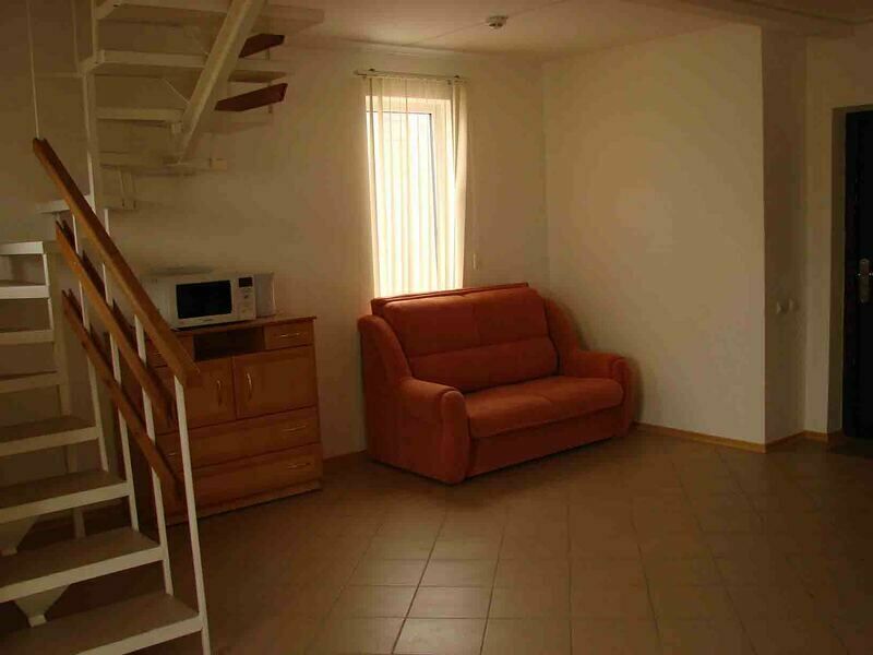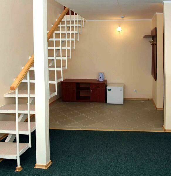 Номер, расположенный на двух уровнях, состоит из гостиной, спальни, прихожей и совмещенного санузла. В спальне и гостиной на полу лежит ковролин, в прихожей и санузле — кафель.