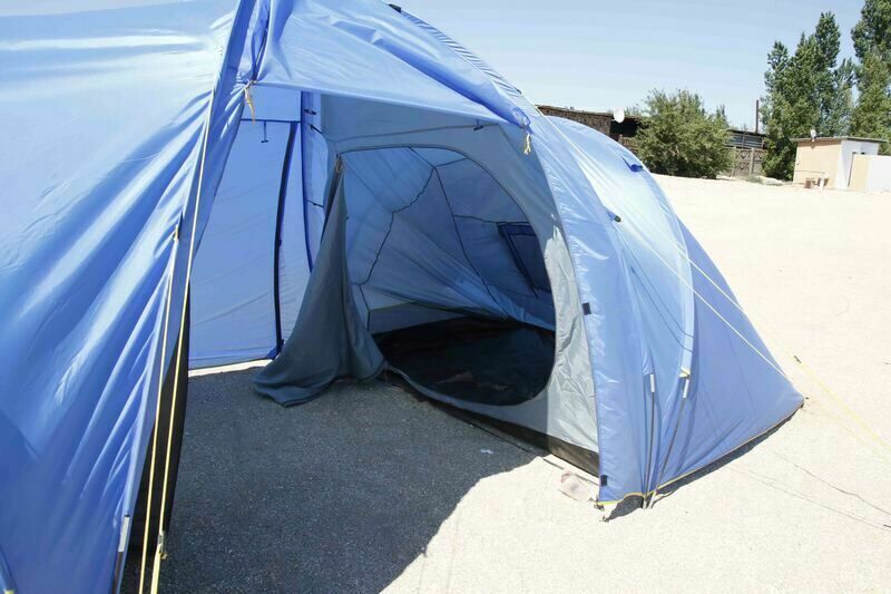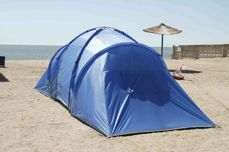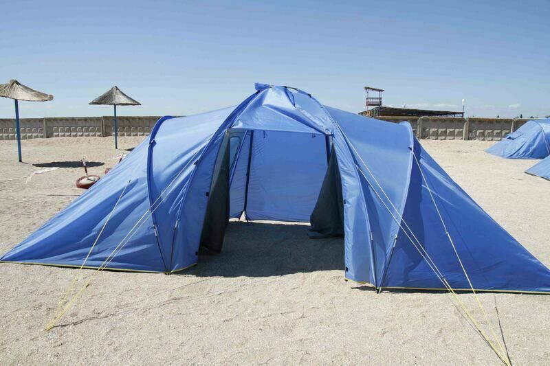 Палатки расположены на берегу моря. Состоят из двух секций. Спальные места – пластиковые лежаки с матрацами. Белье приобретается дополнительно на службе приема и размещения. Душ и санузел находятся в кемперном городке, недалеко от палаток.