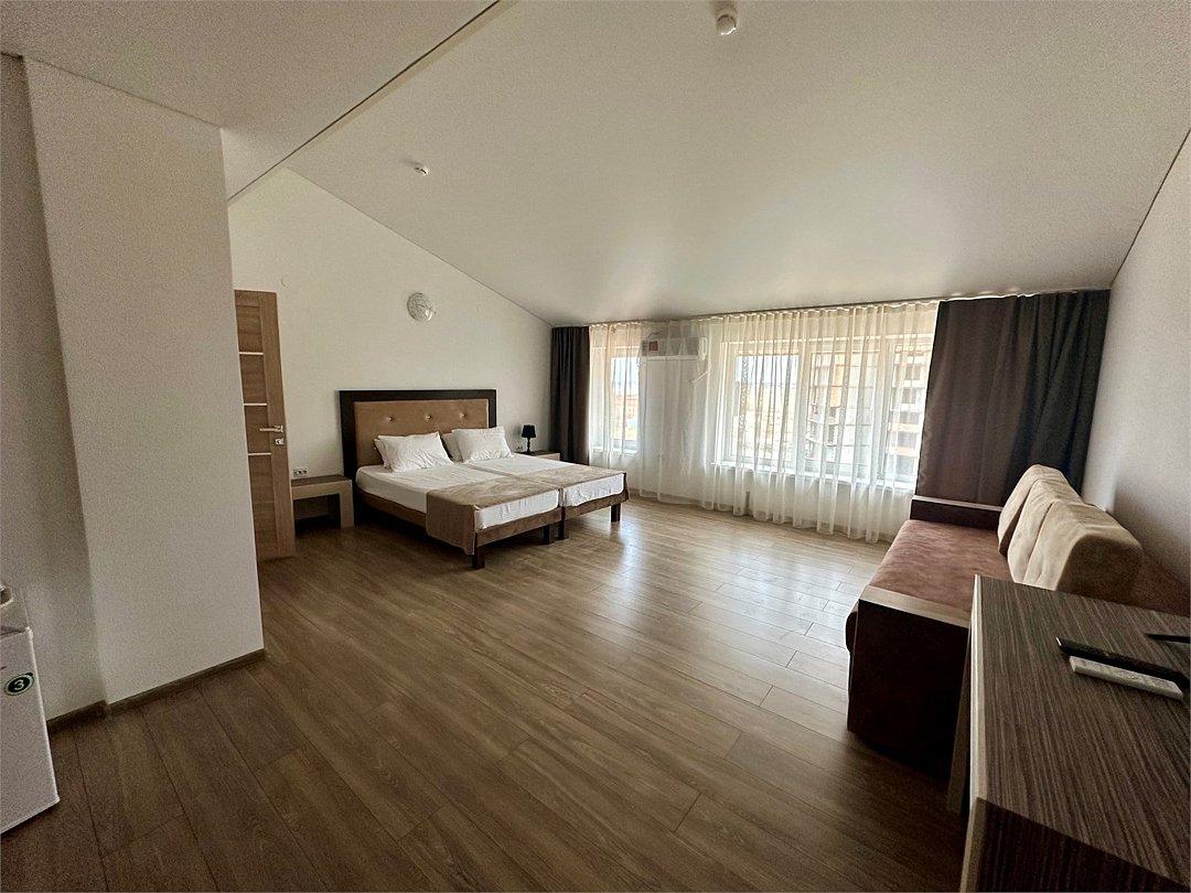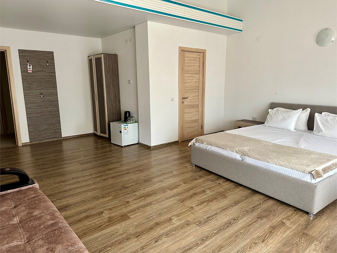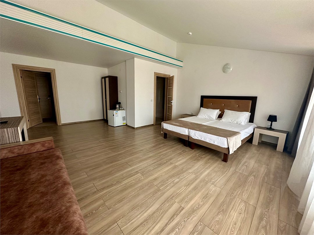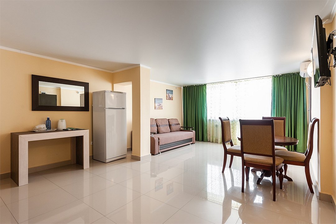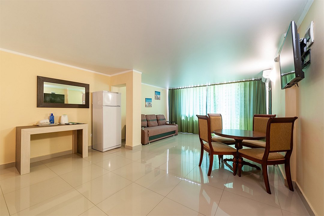 Площадь семейных номеров 42 м2. на 1 этаже Номер рассчитан на 3-4 человек. Состоит из двух комнат, отдельный санузел, душ, Оснащен: двуспальная кровать (King size), раскладной диван, шкаф, письменный стол, обеденный стол со стульями, большой холодильник, два плоский ЖК Телевизоров диагональ 40 дюймов, чайник, сплит система, бесплатный интернет. Также в стоимость номера входит: обогреваемый бассейн, детская площадка, детская игровая комната с аниматорами, игровые приставки Сони PS4, настольный теннис, парк аттракционов, анимационные программы для детей и взрослых, вечерние шоу-программы, аквааэробика в бассейне и на море, уроки танца, оздоровительные дыхательные упражнения на рассвете, и йога на закате у моря, зона барбекю, охраняемая автостоянка, шезлонги. При отеле есть Кафе (система питания шведский стол) завтрак, обед, ужин оплачивается отдельно, дети до 5 лет. бесплатно в сопровождении взрослых .Услуги и удобства