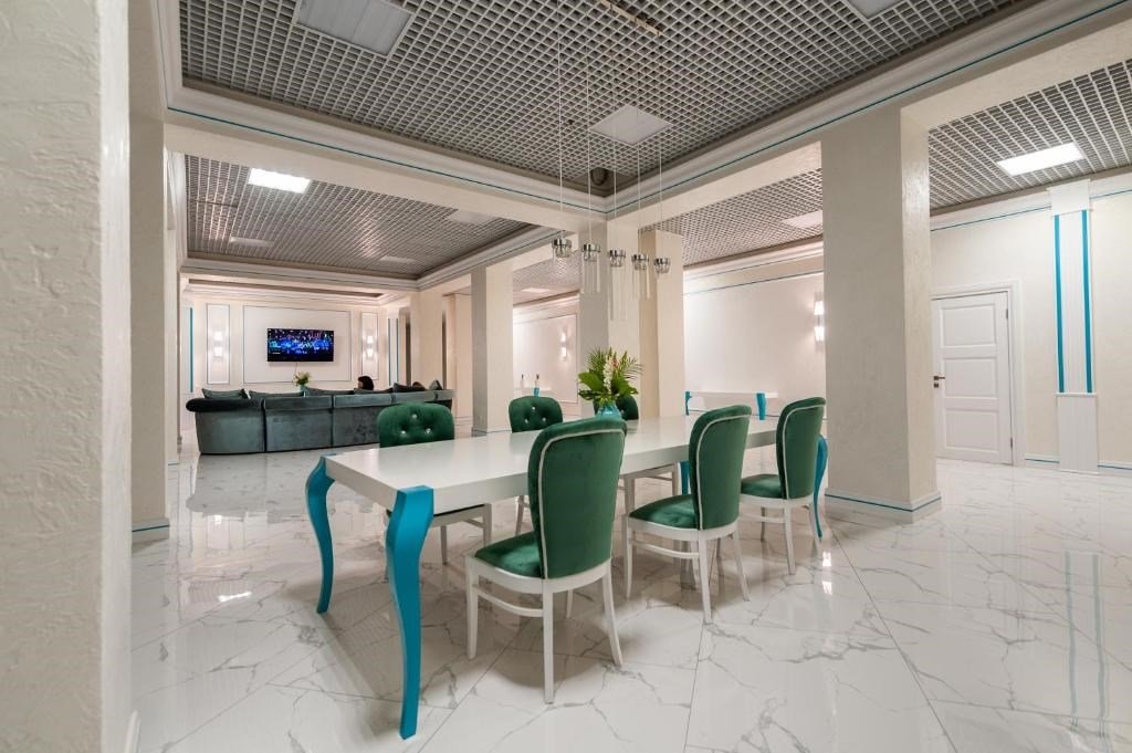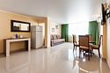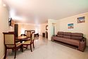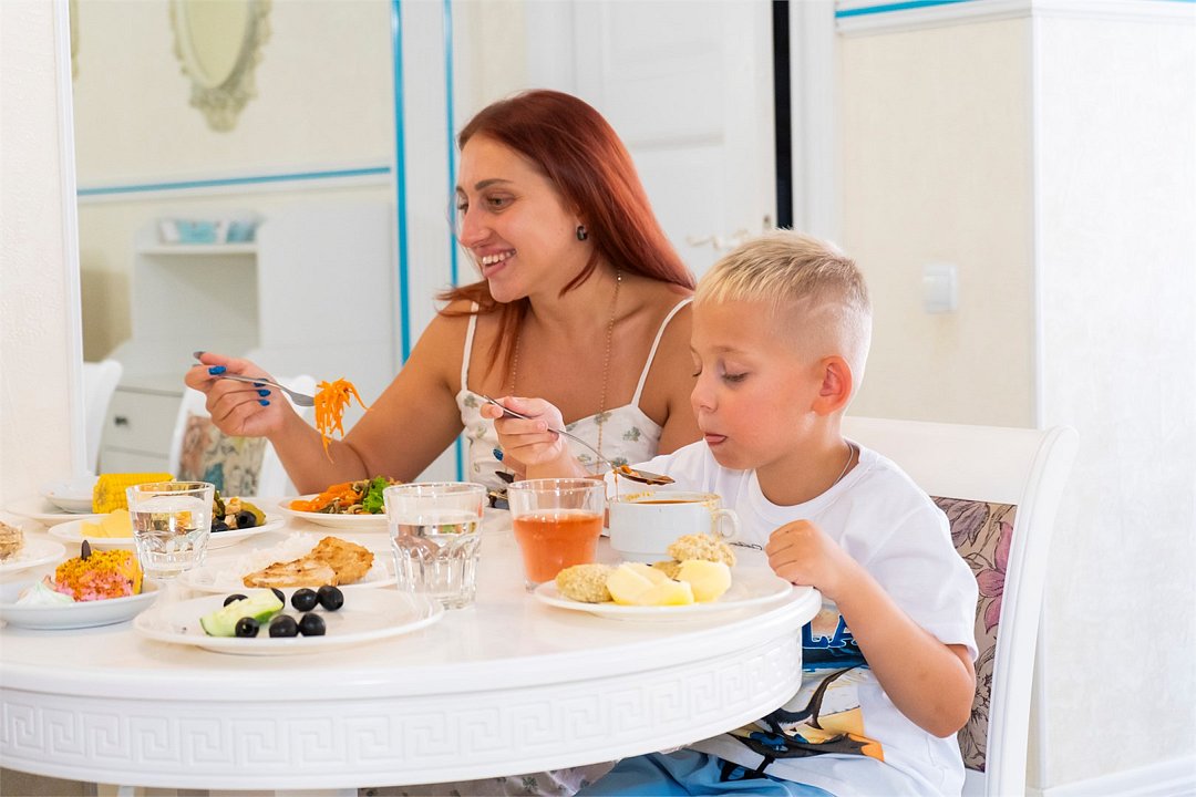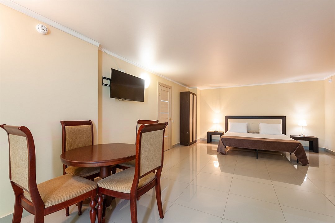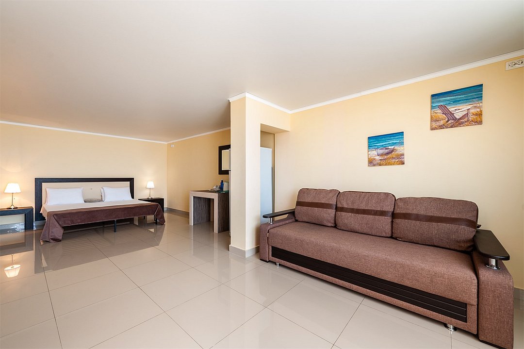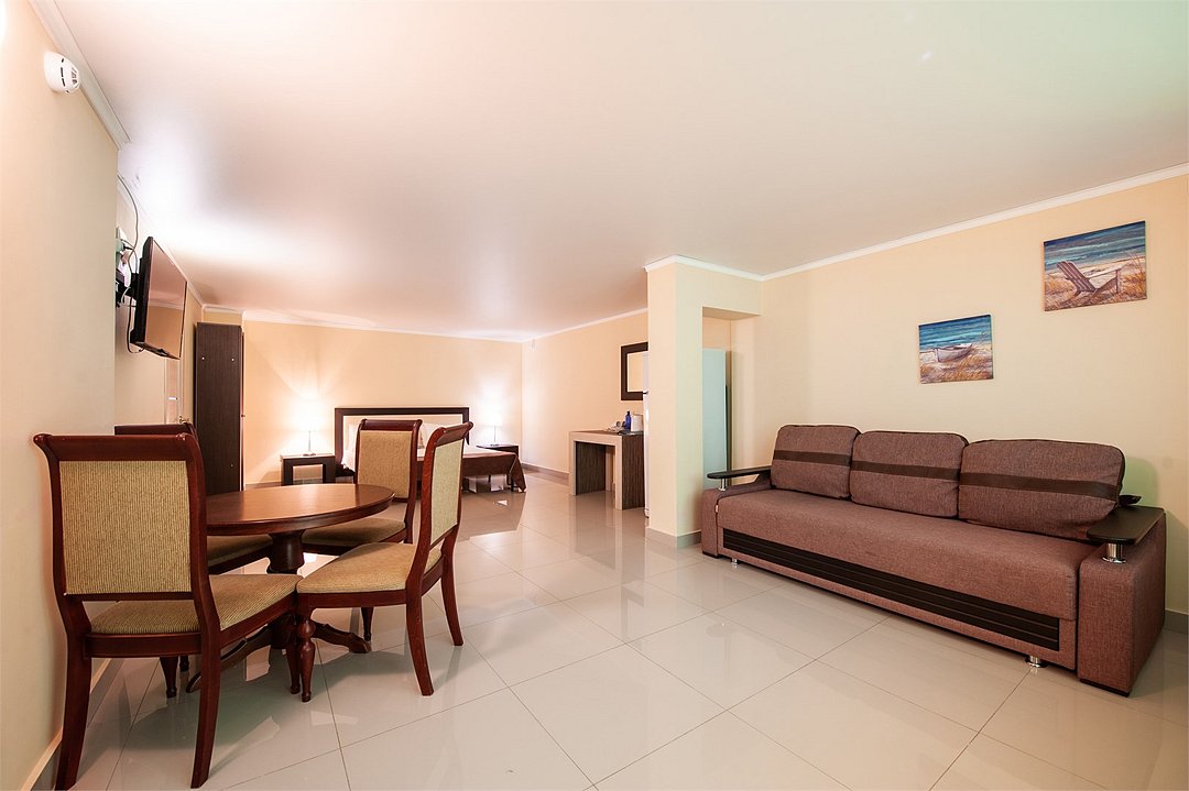 Площадь семейных номеров 42 м2. на 1 этаже Номер рассчитан на 3-4 человек. Состоит из двух комнат, отдельный санузел, душ, Оснащен: двуспальная кровать (King size), раскладной диван, шкаф, письменный стол, обеденный стол со стульями, большой холодильник, два плоский ЖК Телевизоров диагональ 40 дюймов, чайник, сплит система, бесплатный интернет. Также в стоимость номера входит: обогреваемый бассейн, детская площадка, детская игровая комната с аниматорами, игровые приставки Сони PS4, настольный теннис, парк аттракционов, анимационные программы для детей и взрослых, вечерние шоу-программы, аквааэробика в бассейне и на море, уроки танца, оздоровительные дыхательные упражнения на рассвете, и йога на закате у моря, зона барбекю, охраняемая автостоянка, шезлонги. При отеле есть Кафе (система питания шведский стол) завтрак, обед, ужин оплачивается отдельно, дети до 5 лет. бесплатно в сопровождении взрослых .Услуги и удобства
