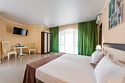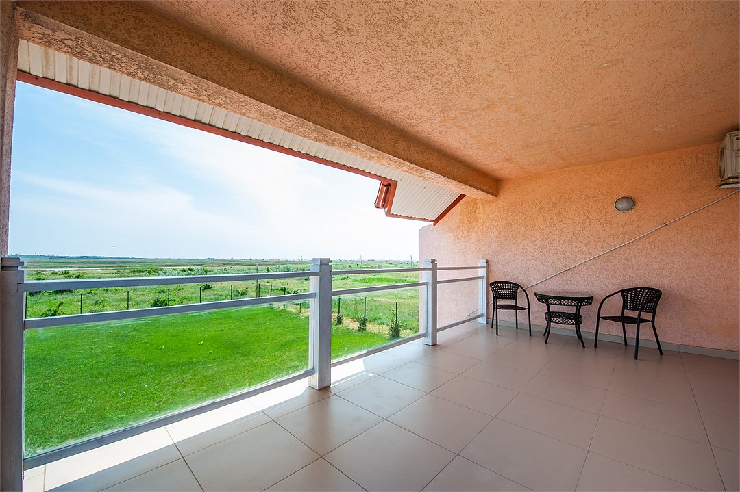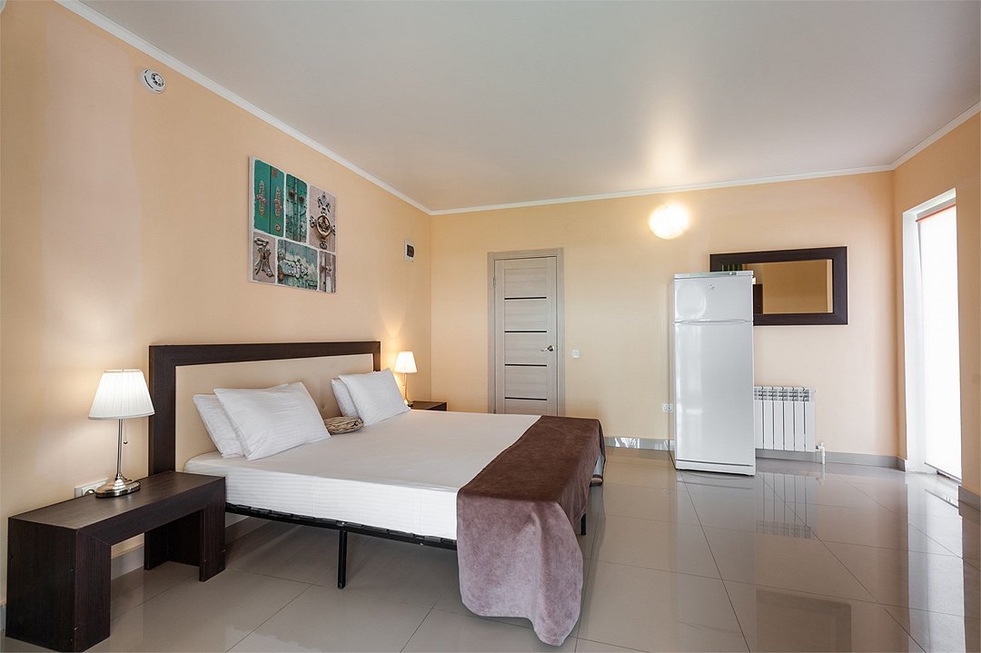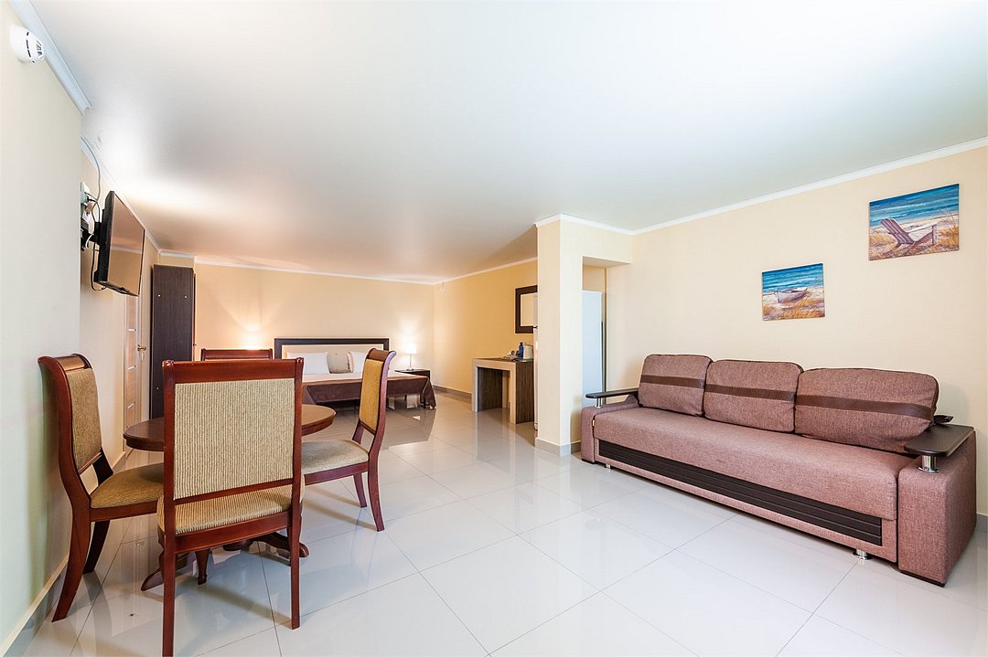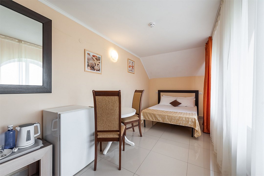 Площадь номеров Полулюкс 27 м2. С больший террасой 20м2. Номер рассчитан на 2-х человек с возможностью предоставления дополнительного места (наличие возможности предоставления дополнительного места и стоимость уточняйте у администратора). Во всех номерах есть санузел, душ, двуспальная кровать, вешалка, письменный стол, чайный столик со стульями, холодильник, плоский ЖК-телевизор диагональю 40 дюймов, чайник, сплит-система, бесплатный интернет. Также в стоимость номера входит: обогреваемый бассейн, детская площадка, детская игровая комната с аниматорами, игровые приставки Сони PS4, настольный теннис, парк аттракционов, анимационные программы для детей и взрослых, вечерние шоу-программы, аквааэробика в бассейне и на море, уроки танца, оздоровительные дыхательные упражнения на рассвете, и йога на закате у моря, зона барбекю, охраняемая автостоянка, шезлонги. При отеле есть кафе (система питания шведский стол) завтрак, обед, ужин оплачивается отдельно, дети до 5 лет - бесплатно.Услуги и удобства