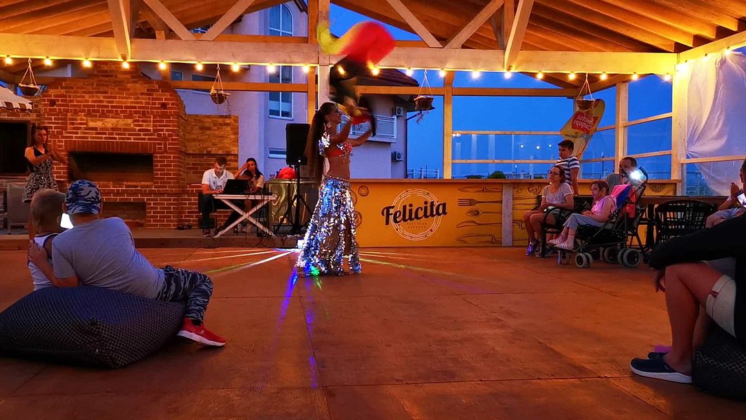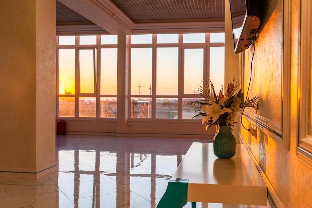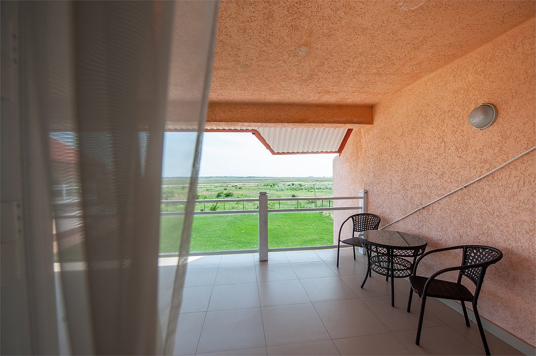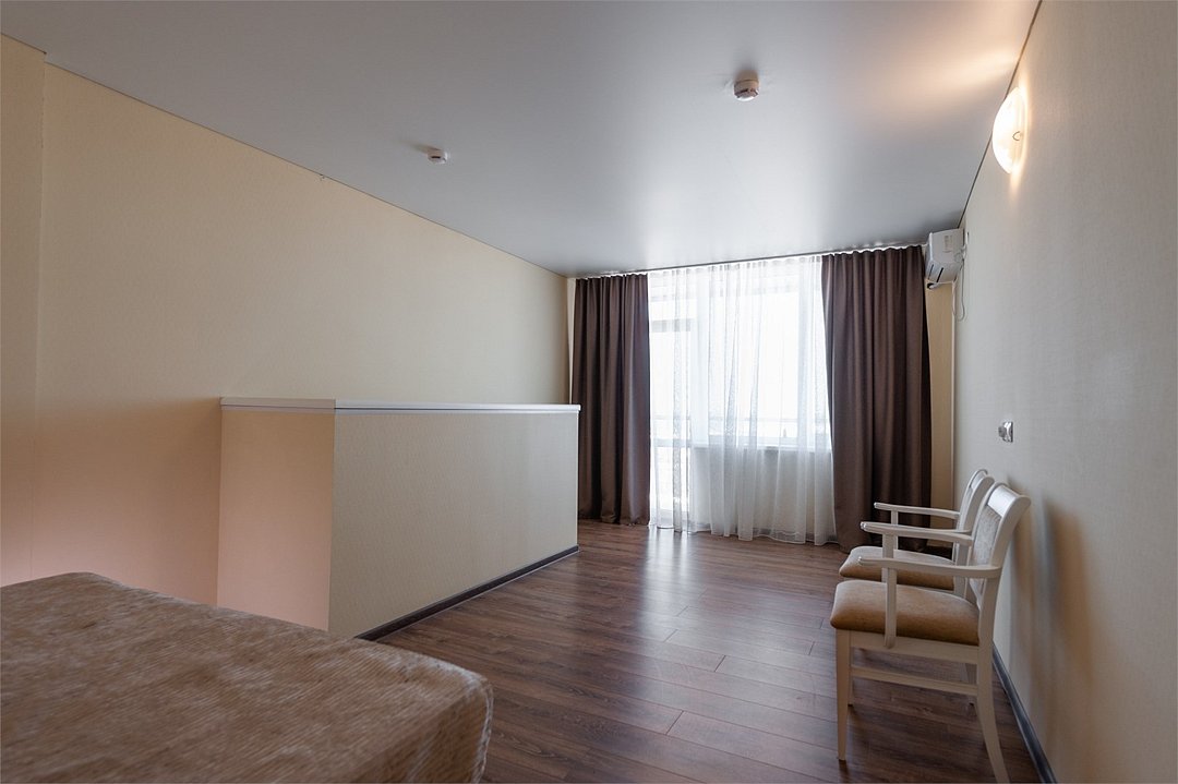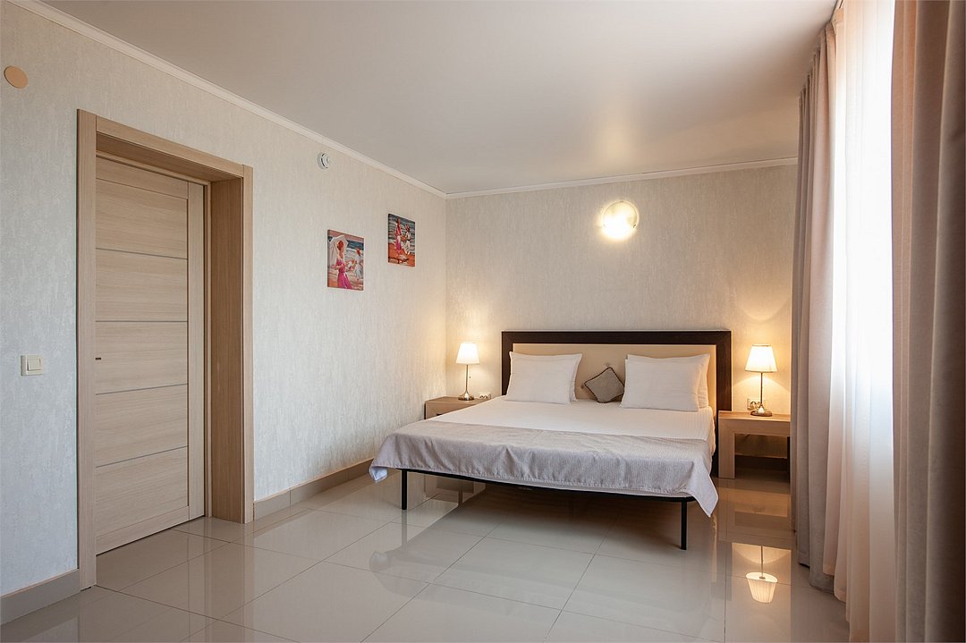 Площадь номеров Полулюкс 27 м2. С больший террасой 20м2. Номер рассчитан на 2-х человек с возможностью предоставления дополнительного места (наличие возможности предоставления дополнительного места и стоимость уточняйте у администратора). Во всех номерах есть санузел, душ, двуспальная кровать, вешалка, письменный стол, чайный столик со стульями, холодильник, плоский ЖК-телевизор диагональю 40 дюймов, чайник, сплит-система, бесплатный интернет. Также в стоимость номера входит: обогреваемый бассейн, детская площадка, детская игровая комната с аниматорами, игровые приставки Сони PS4, настольный теннис, парк аттракционов, анимационные программы для детей и взрослых, вечерние шоу-программы, аквааэробика в бассейне и на море, уроки танца, оздоровительные дыхательные упражнения на рассвете, и йога на закате у моря, зона барбекю, охраняемая автостоянка, шезлонги. При отеле есть кафе (система питания шведский стол) завтрак, обед, ужин оплачивается отдельно, дети до 5 лет - бесплатно.Услуги и удобства
