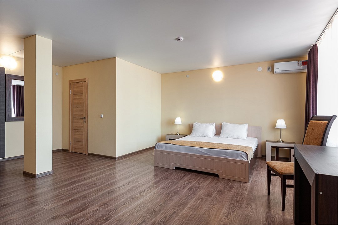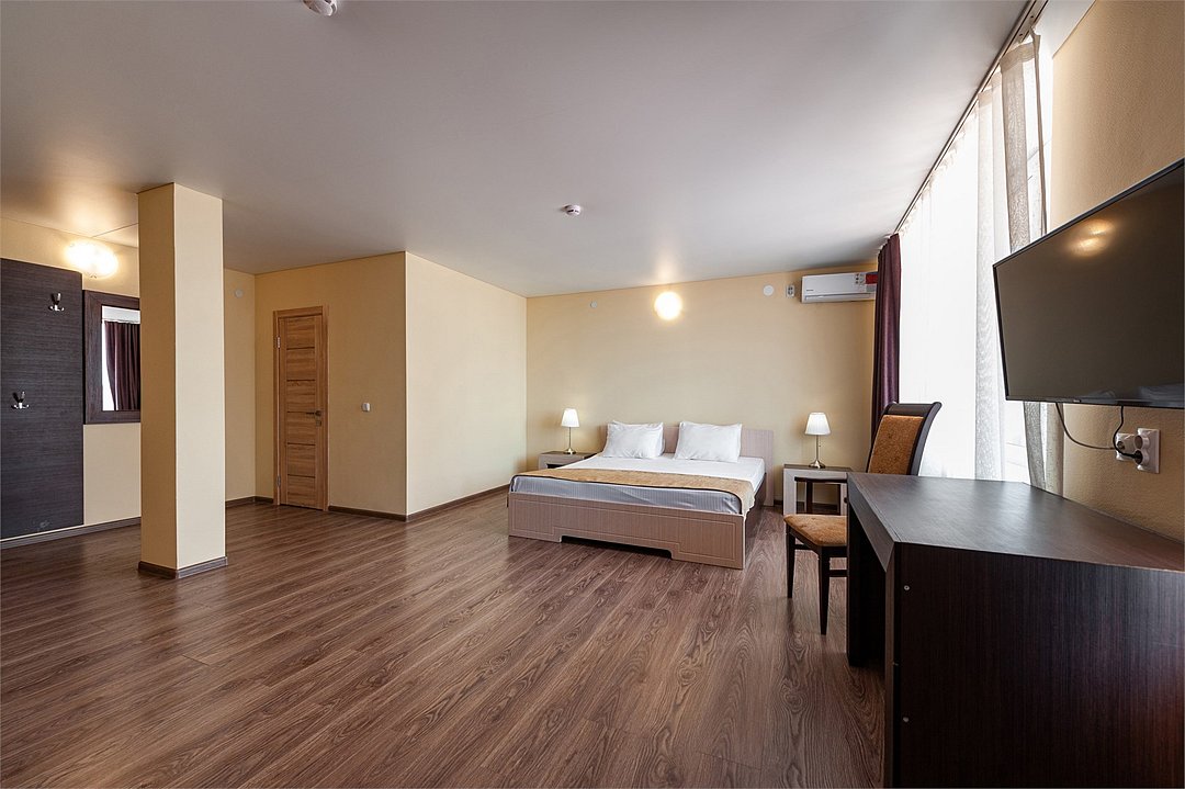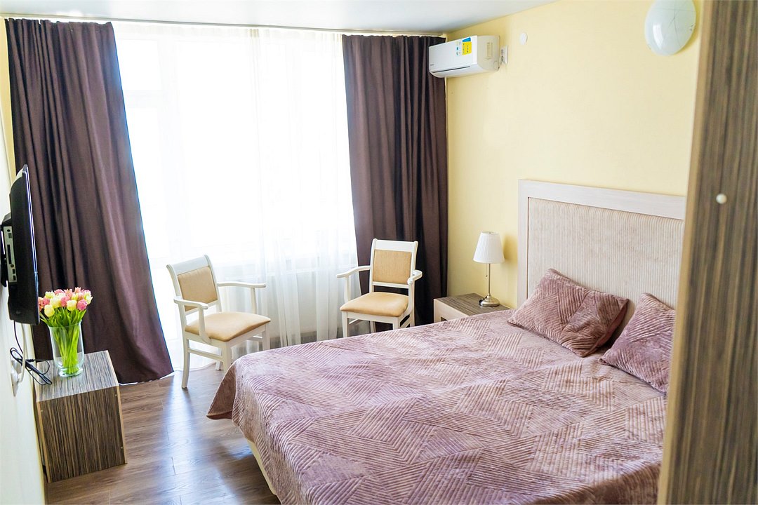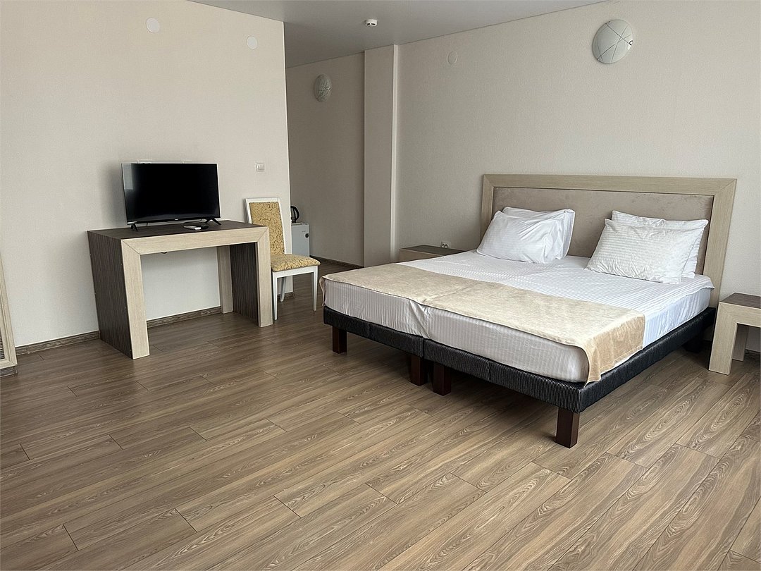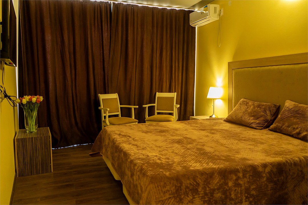 Площадь номеров стандарт от 20 до 22 м2. С балконом. Номер рассчитан на 2 человек. Во всех номерах есть санузел, душ, двуспальная кровать, вешалка, письменный стол, чайный столик со стульями, холодильник, Плоский ЖК Телевизор диагональ 30 дюймов, чайник, сплит система, бесплатный интернет. Также в стоимость номера входит: Детская площадка, детская игровая комната с аниматорами, зона барбекю, охраняемая автостоянка, занятия йогой. При отеле есть Кафе (система питания шведский стол) завтрак, обед, ужин оплачивается отдельно, дети до 5 лет. бесплатно в сопровождении взрослых.Услуги и удобства