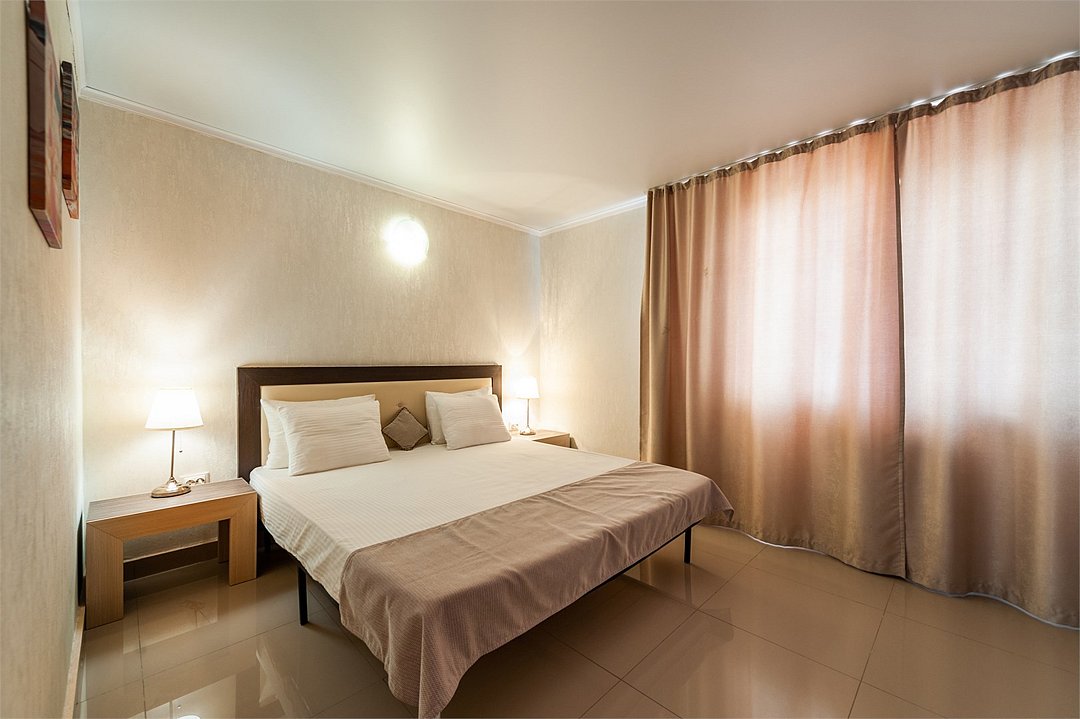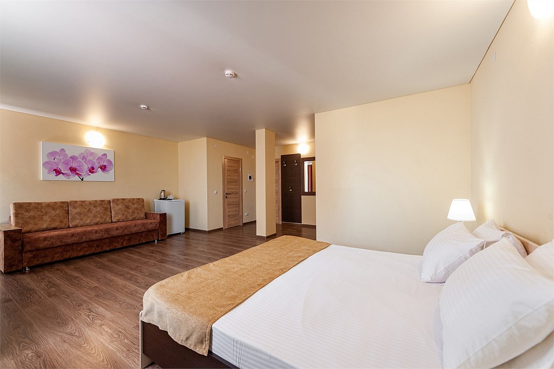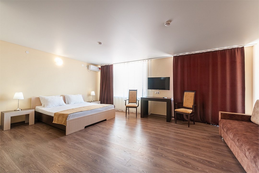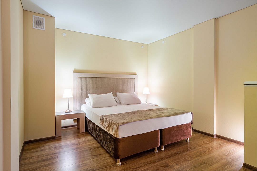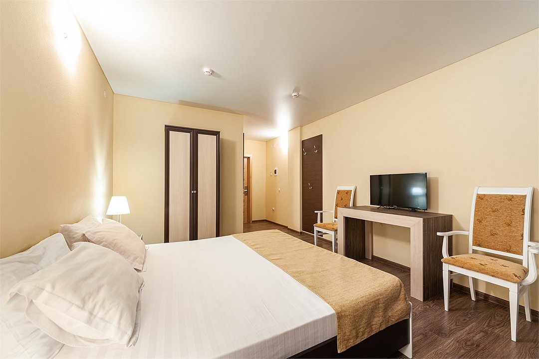 Площадь номеров стандарт от 20 до 22 м2. С балконом. Номер рассчитан на 2 человек. Во всех номерах есть санузел, душ, двуспальная кровать, вешалка, письменный стол, чайный столик со стульями, холодильник, Плоский ЖК Телевизор диагональ 30 дюймов, чайник, сплит система, бесплатный интернет. Также в стоимость номера входит: Детская площадка, детская игровая комната с аниматорами, зона барбекю, охраняемая автостоянка, занятия йогой. При отеле есть Кафе (система питания шведский стол) завтрак, обед, ужин оплачивается отдельно, дети до 5 лет. бесплатно в сопровождении взрослых.Услуги и удобства