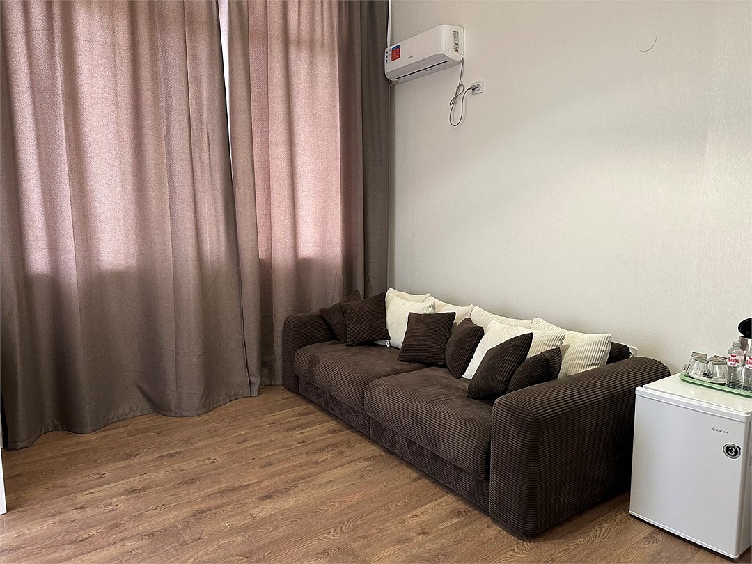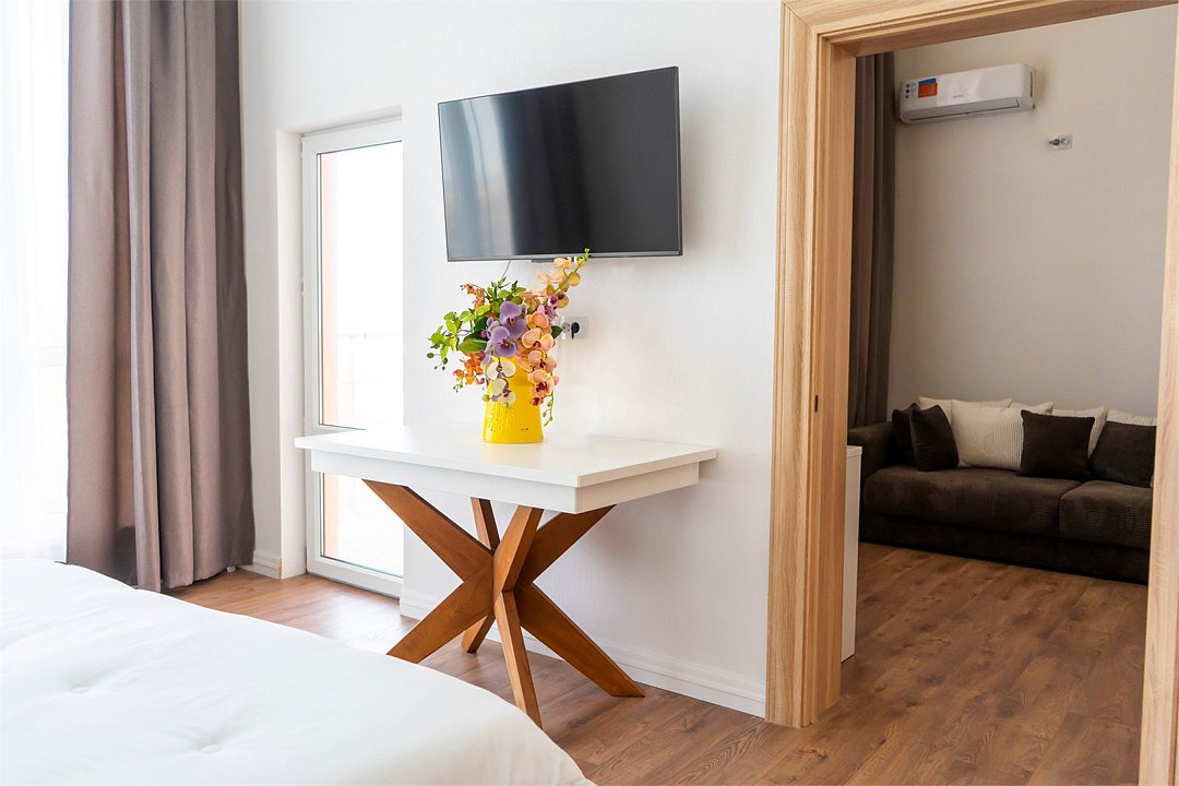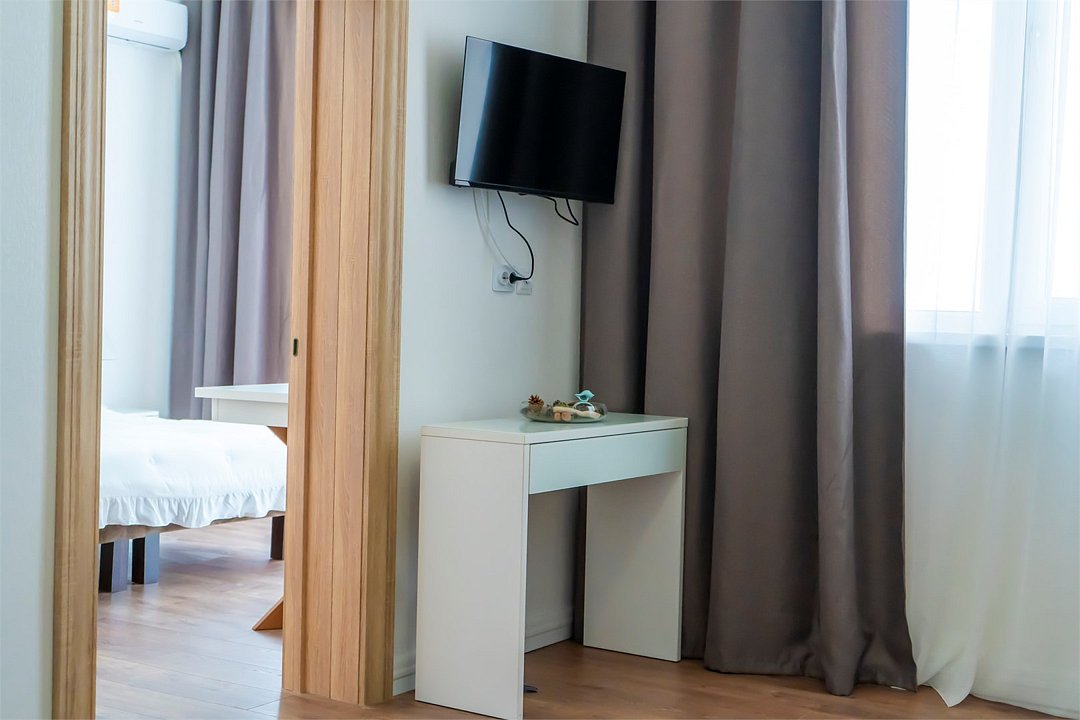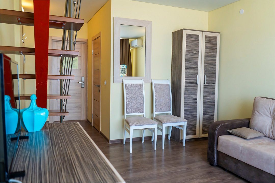 телевизор, Wi-Fi, настольные лампы, электронные замки, душевая кабина, банные полотенца, тапочки, гигиенические средства, балкон, двуспальная кровать, диван, тумбы, стулья, шкаф для одежды, вешалки, зеркало, две комнаты, чайный набор, информационная карта, меню, унитаз, раковина, вид на море, ламинат, стол, сплит-система, сушилка для белья, диван-кровать, телевизор с плоским экраном, мини-холодильник, можно с питомцамиВ гостиничном номере
