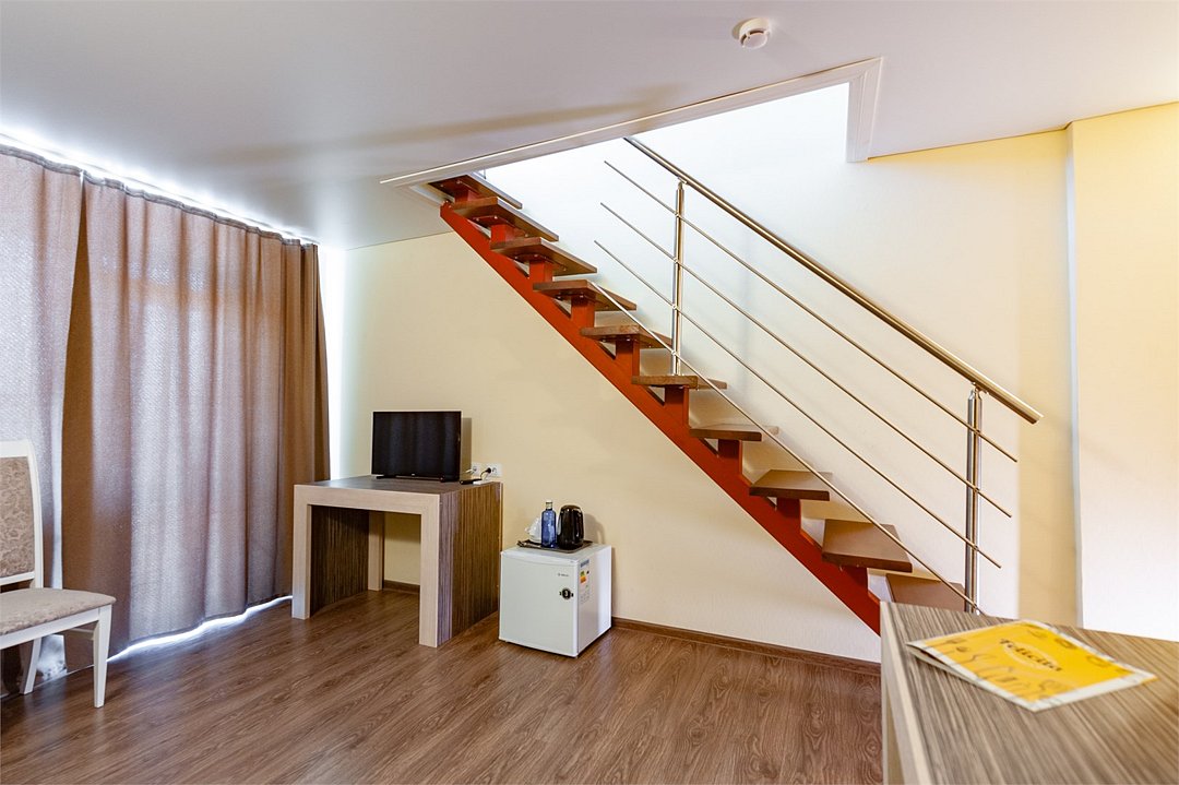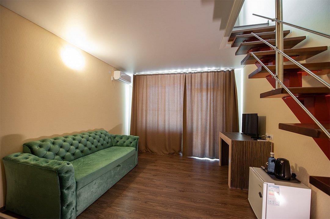 Площадь семейного номера 40 м2. Номер рассчитан на 3-4 человек. Состоит из двух комнат, по одной комнате на каждом этаже, отдельный санзуел с душевой кабиной. Оснащен: 1 двуспальная кровать (King size), диван на два спальных места, шкаф, письменный стол, обеденный стол со стульями, холодильник, плоский ЖК телевизор диагональ 40 дюймов, чайник, сплит система, бесплатный интернет. Также в стоимость номера входит: обогреваемый бассейн, детская площадка, детская игровая комната с аниматорами, игровые приставки Сони PS4, настольный теннис, парк аттракционов, анимационные программы для детей и взрослых, вечерние шоу-программы, аквааэробика в бассейне и на море, уроки танца, оздоровительные дыхательные упражнения на рассвете, и йога на закате у моря, зона барбекю, охраняемая автостоянка, шезлонги. При отеле есть Кафе (система питания шведский стол) завтрак, обед, ужин оплачивается отдельно, дети до 5 лет. бесплатно в сопровождении взрослых .Услуги и удобства