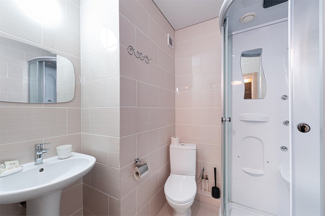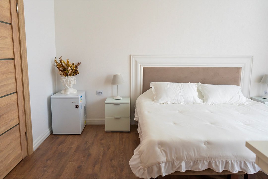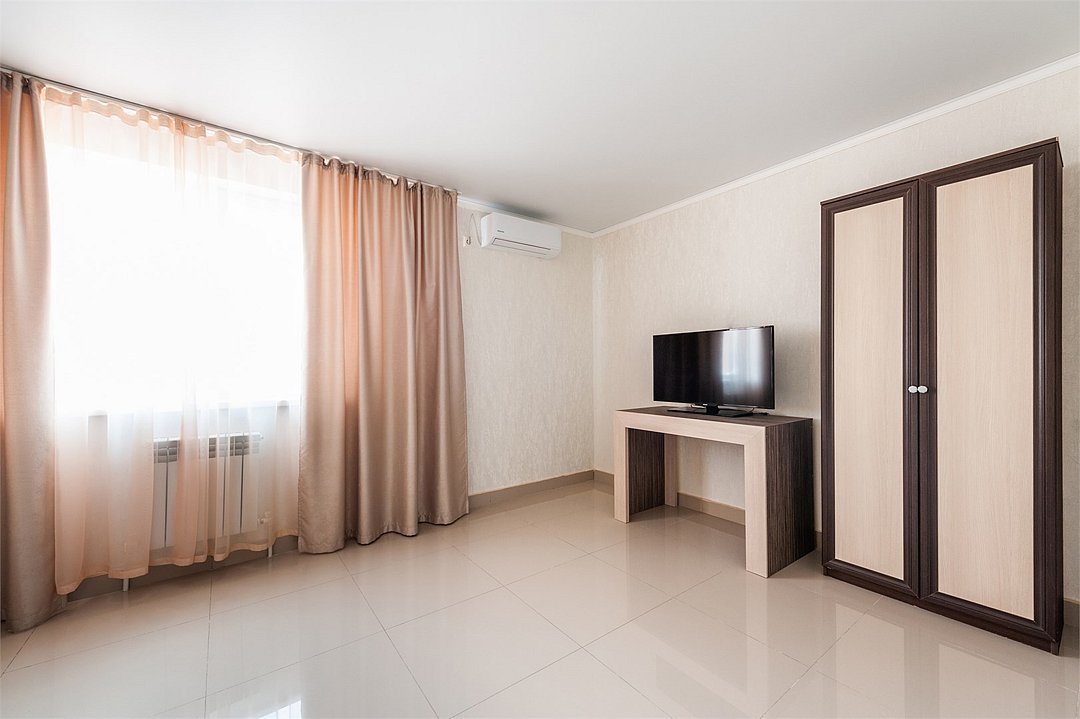телевизор, Wi-Fi, холодильник, кондиционер, электронные замки, душевая кабина, санузел, банные полотенца, пляжные полотенца, две односпальные или большая двуспальная кровать, тумбы, стулья, шкаф для одежды, вешалки, унитаз, раковина, общая ванная комната, стол, туалетные средства, сушилка для белья, диван-кровать, бутилированная вода, мыло, затемняющая штора, без вида, можно с питомцамиВ гостиничном номере