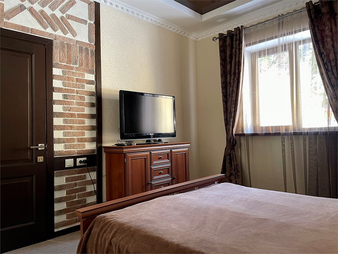 В номере две комнаты. В одной комнате двухспальная кровать, во второй - двухспальная кровать и раскладной диван. Комнаты просторные, есть балкон, телевизоры. Санузел один на две комнаты. Постельное белье и полотенца предоставляются.