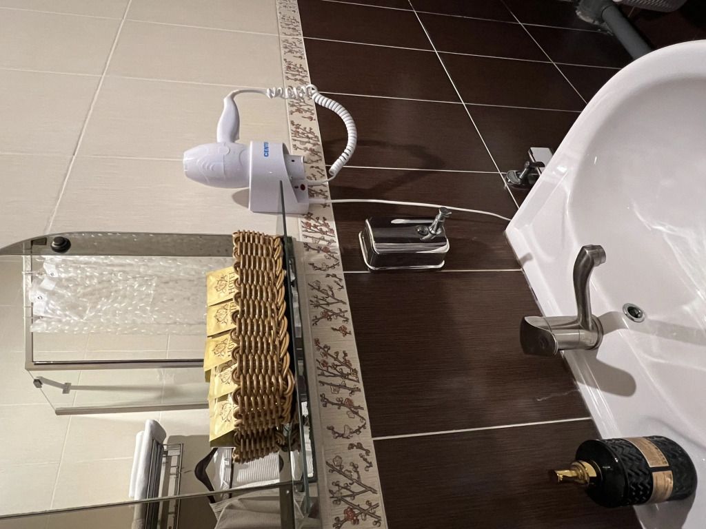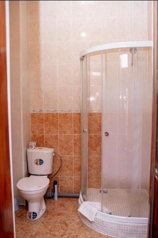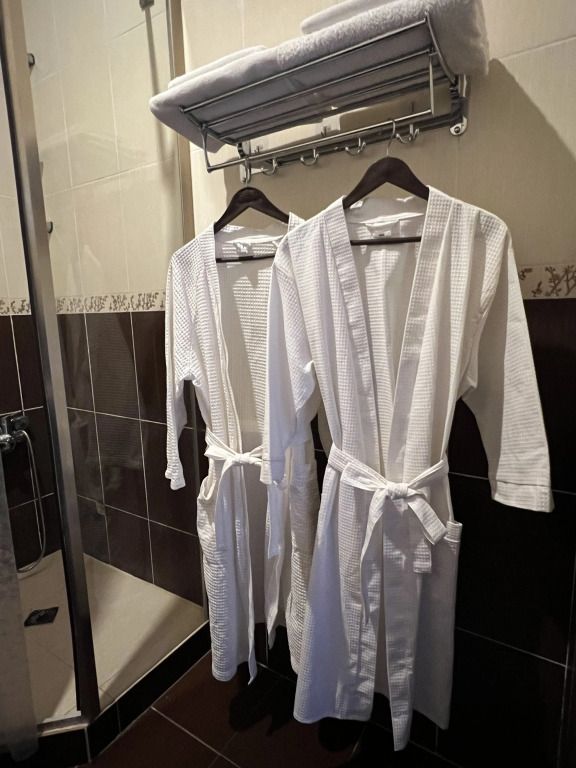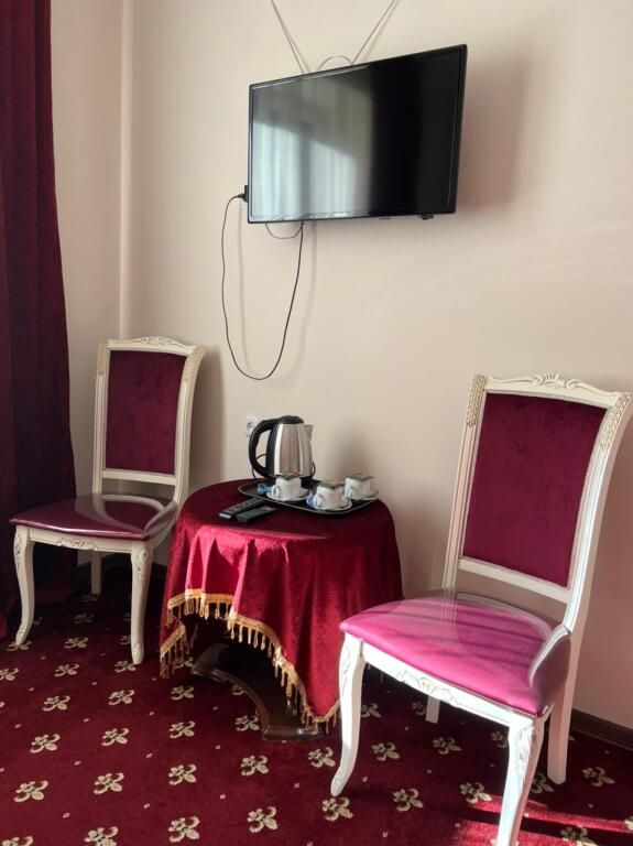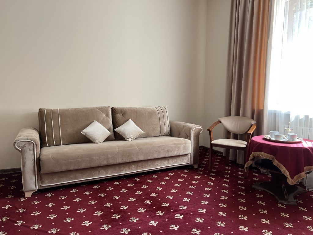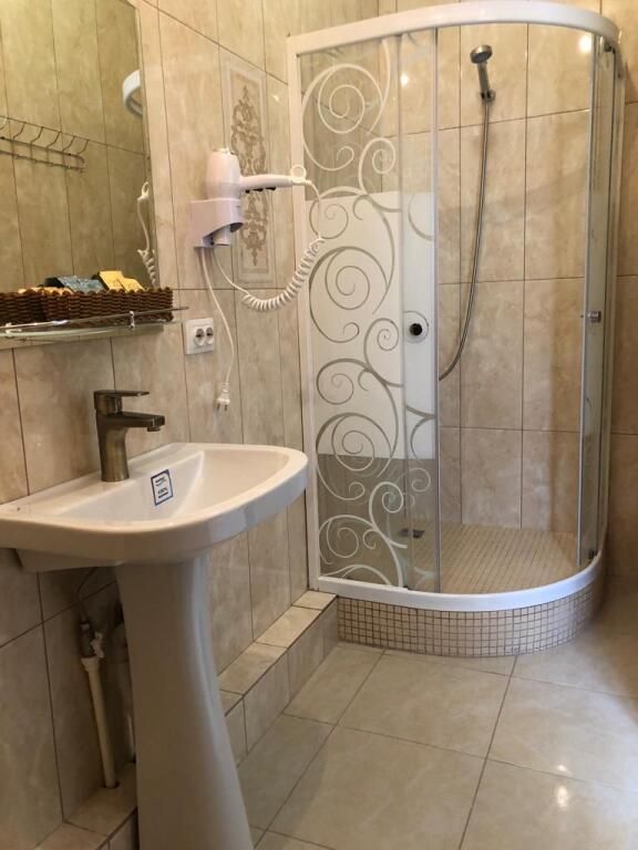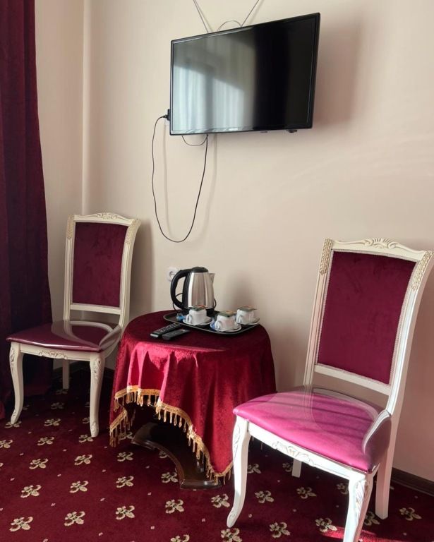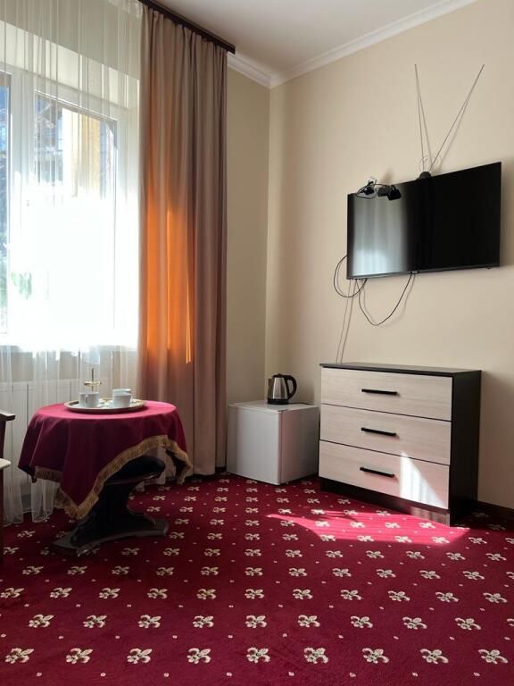 В номере: раздельные мягкие кровати, шифоньер, зеркало, ковер, телевизор, журнальный столик, два мягких стула, душевая кабина.