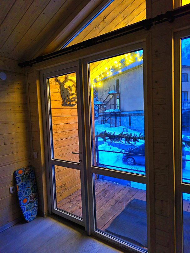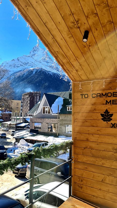 Коттедж находится в центре Домбая, подъемник в двух минутах ходьбы. Площадь участка — 100 соток.
