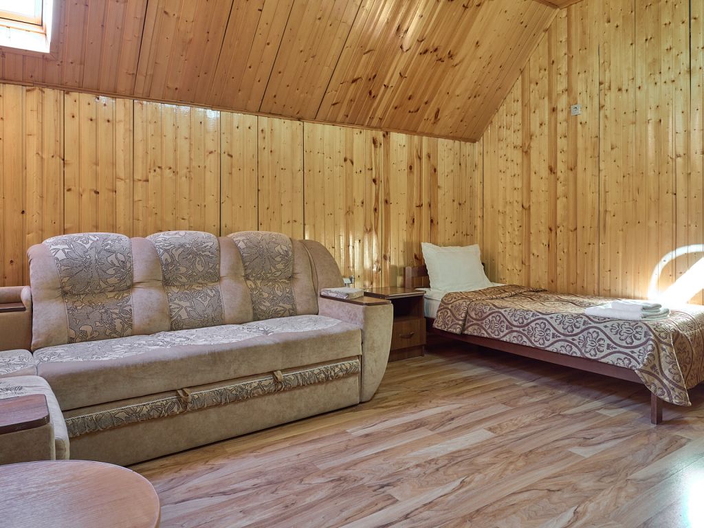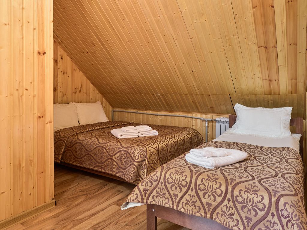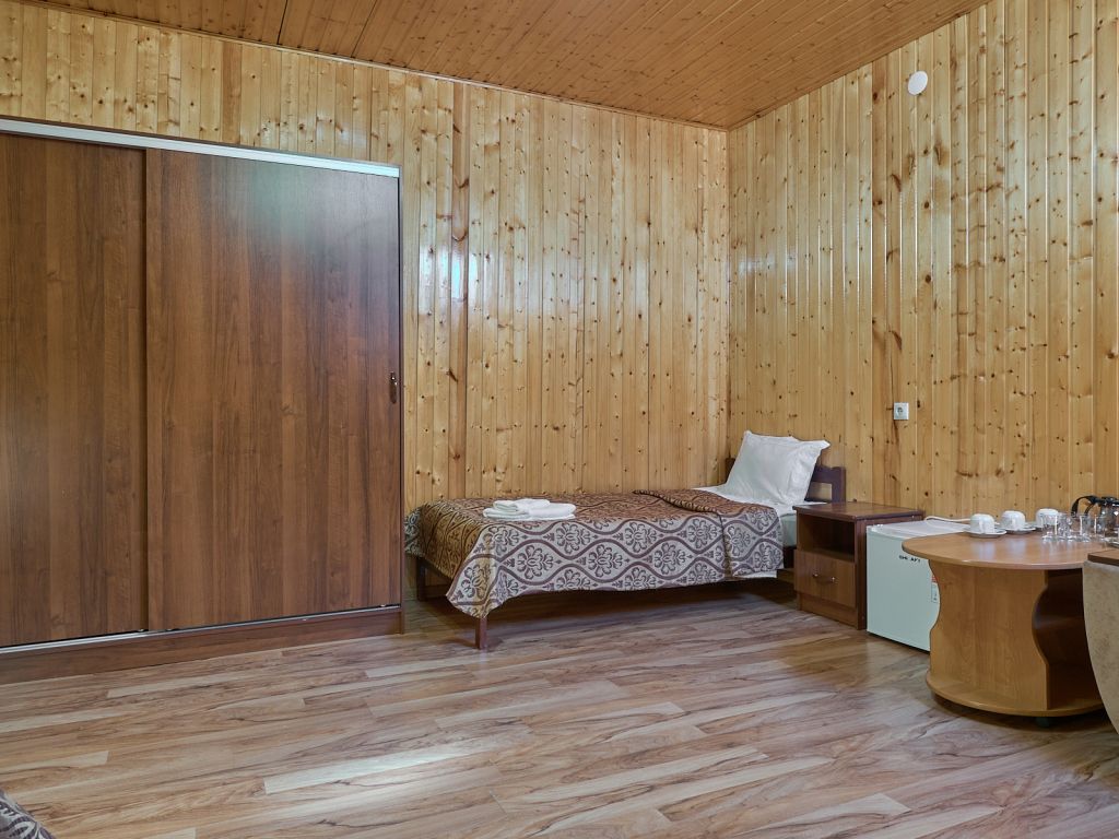 Номер был для нас удобным, чистым, с балкончиком и изумительным видом на горы и горное ущелье. Двухкомнатный, с удобными спальными местами, чистым постельным бельём. Каждому предоставили комплект полотенец+отличные тапочки+гель/шампунь/мыло. В ванной есть фен, душевая кабинка. С водой проблем не было, мягкая, природная-мы такое любим.