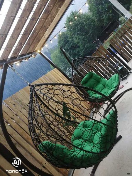 Зона отдыха со столами и кресло-качалками, навесом.