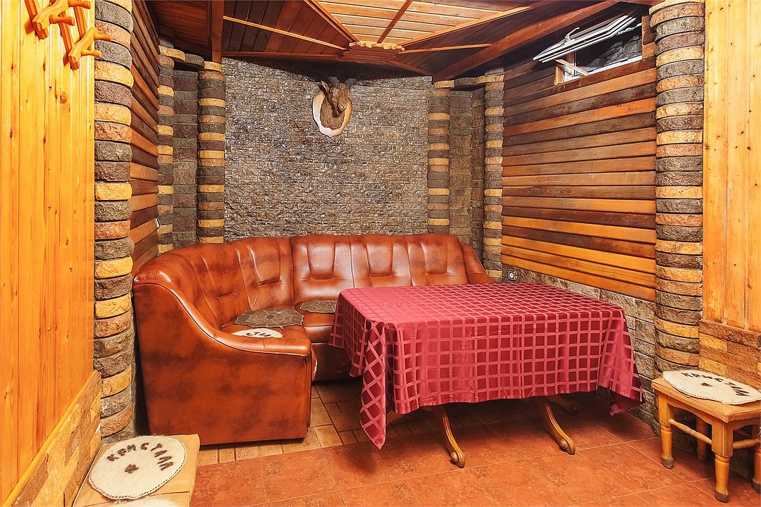 В бане предусмотрено все, что необходимо для хорошего отдыха: уютная гостиная с телевизором, чайные принадлежности, купель, парилка.