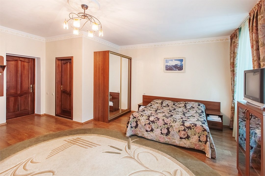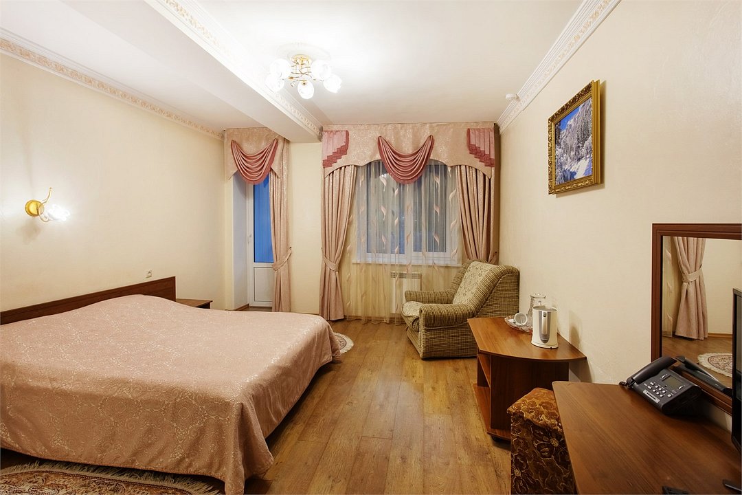 Комфортабельный номер Люкс площадью 36 кв.м с балконом оснащен ЖК-телевизором со спутниковыми каналами и телефоном. Номер разделен на спальную и гостиную зону. К вашим услугам сейф. Меблировка включает мягкий уголок и гардеробный шкаф. В ванной комнате вы найдете фен, халат, тапочки и туалетные принадлежности.Услуги и удобства