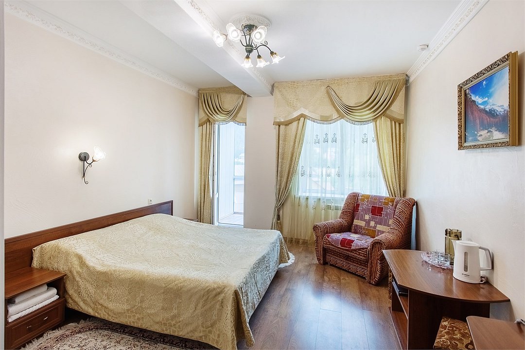 Путешествие в одиночкуХочу вернуться 🫶🏻Отель оказался прекрасным! Сказочный вид из номера: на горы и реку. Очень впечатлило!!! Отель расположен в центре поселка, рядом магазины, аптека, рынок, канатка. В самом отеле все чистенько. Есть гладильная комната. Номер был просторный, со всем необходимым: фен, чайник, посуда, сейф, холодильник, тв. Каждый день меняли полотенца и пополняли душевые принадлежности. Полотенца и постельное белье белоснежные). Завтраки сытные, обедала и ужинала в разных местах. Но ресторан «Кристалл» понравился больше всего, особенно еда с мангала 👍🏻 Приятная атмосфера на веранде с видом на горную реку. И в отеле, и в ресторане персонал доброжелательный, отзывчивый, придраться не к чему. Очень приятно, что поездка оказалась шикарной!